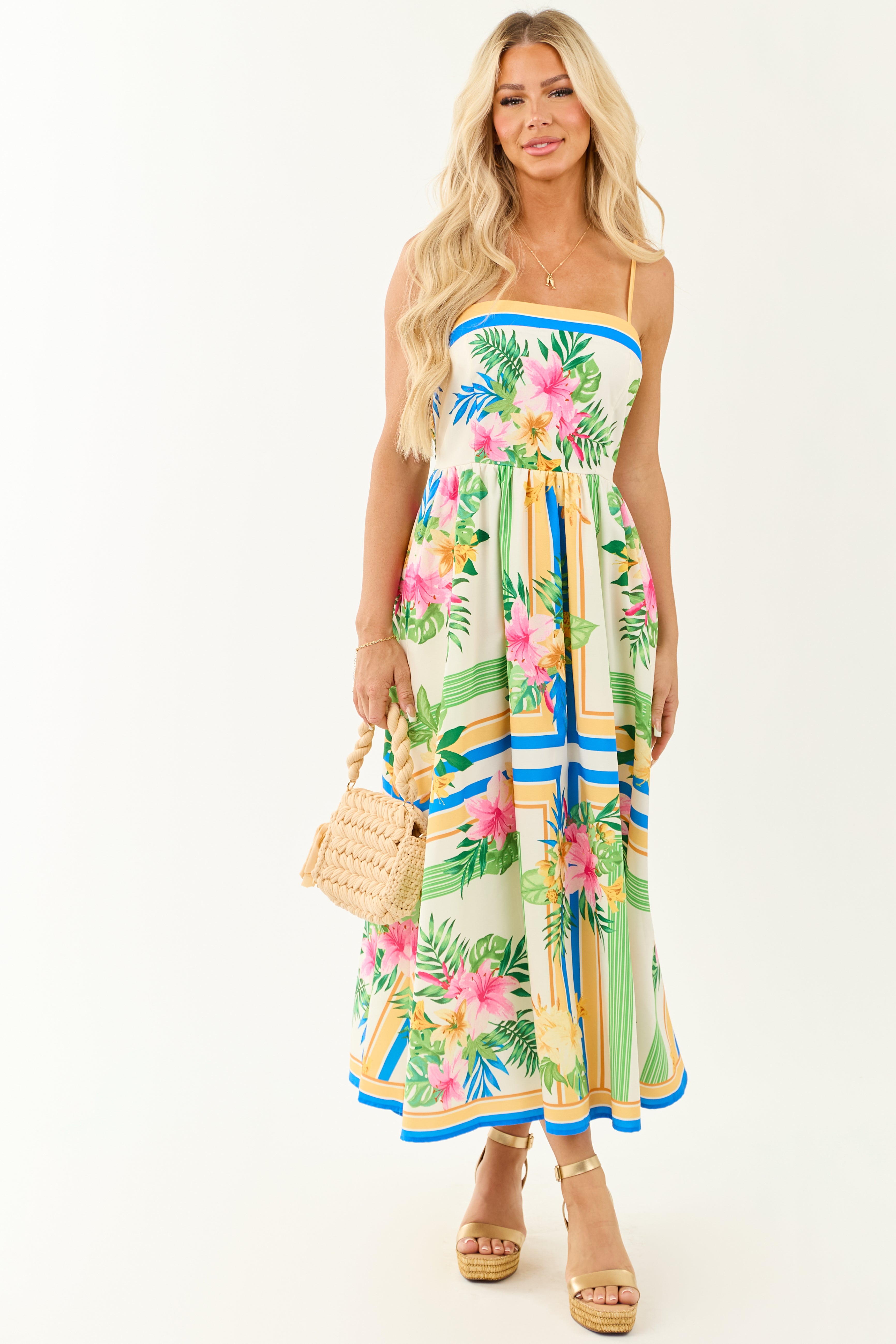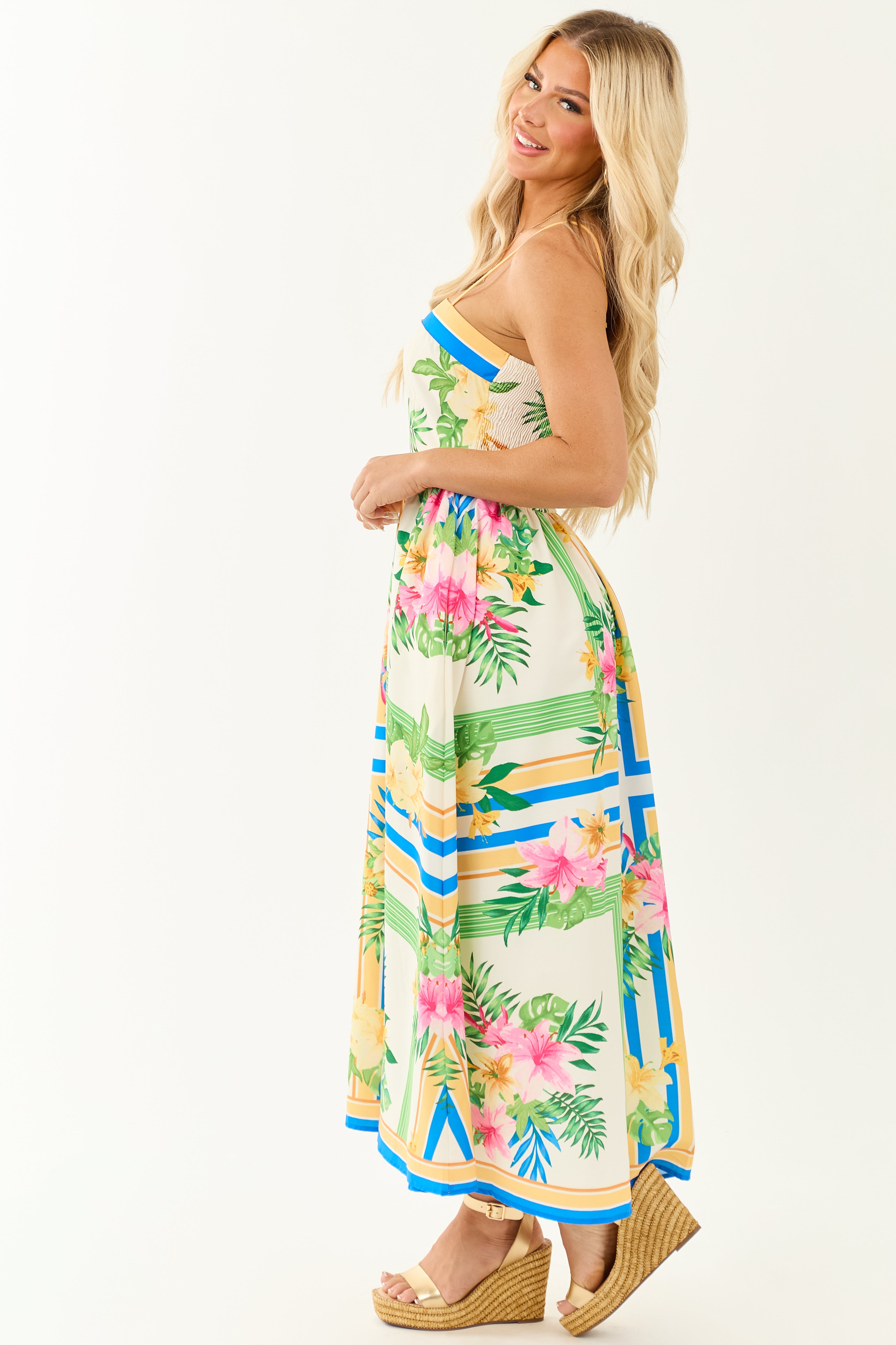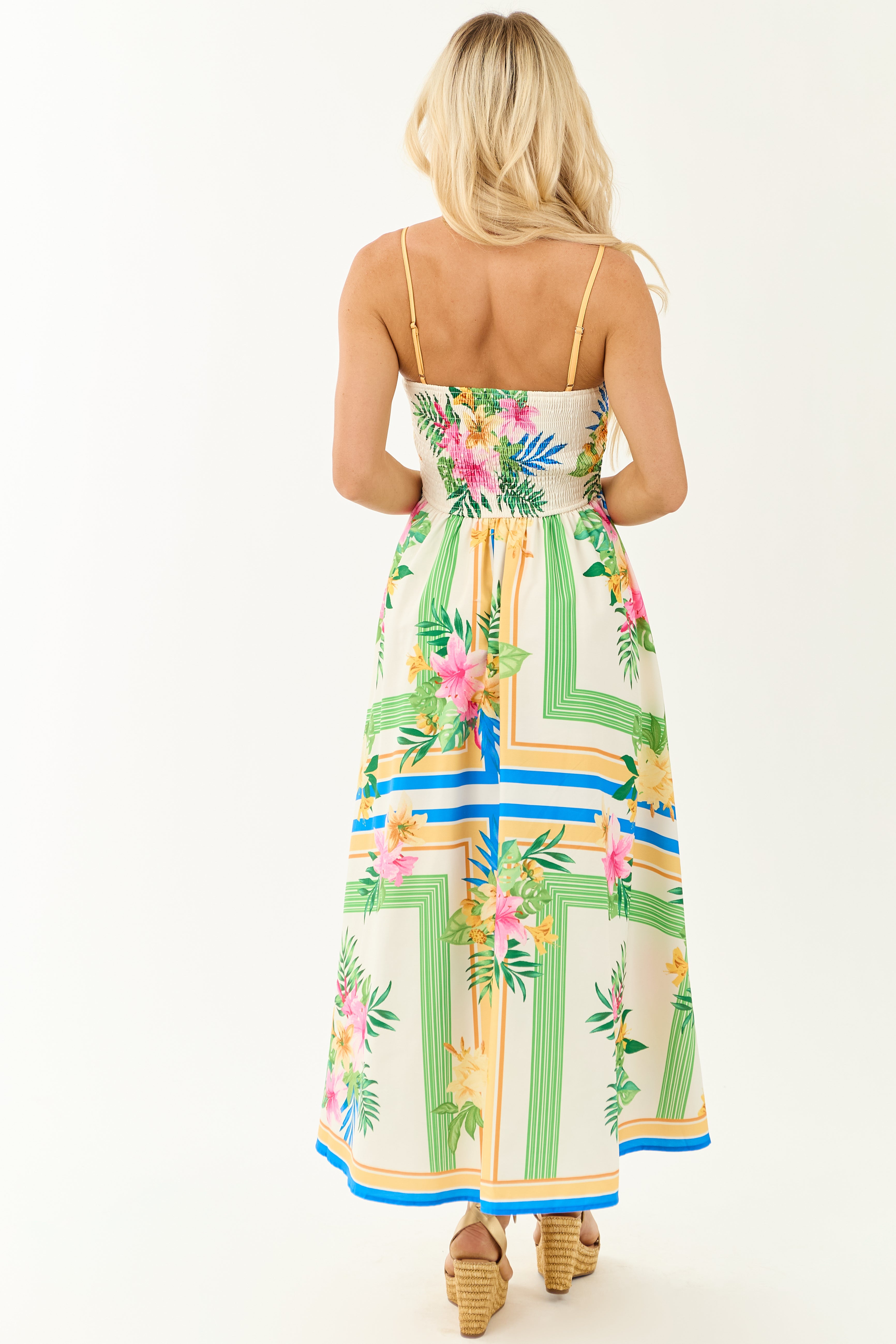 - A flowy favorite for sun-drenched days and vacay getaways. Featuring a smocked back for a forgiving fit bodice and breezy skirt.