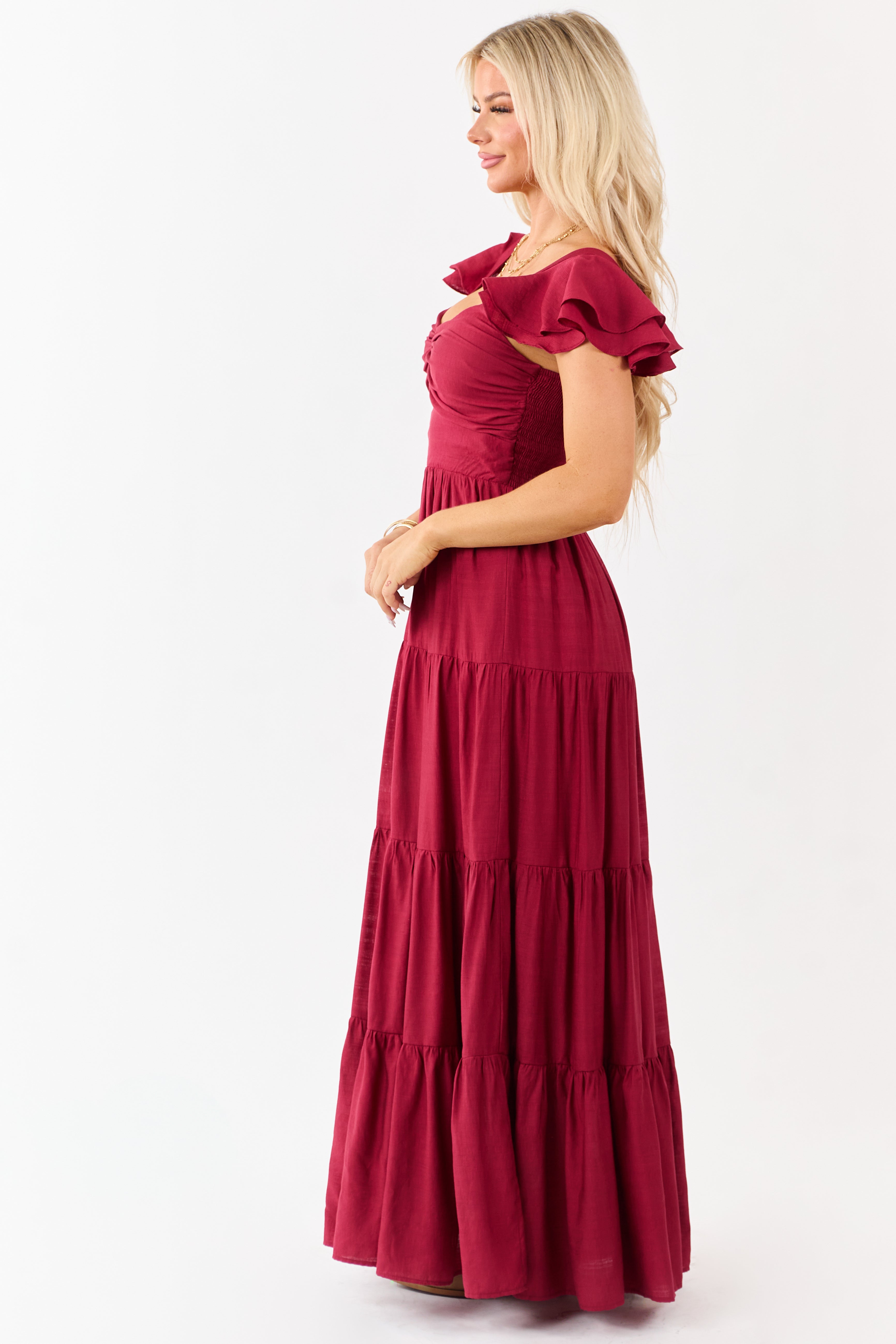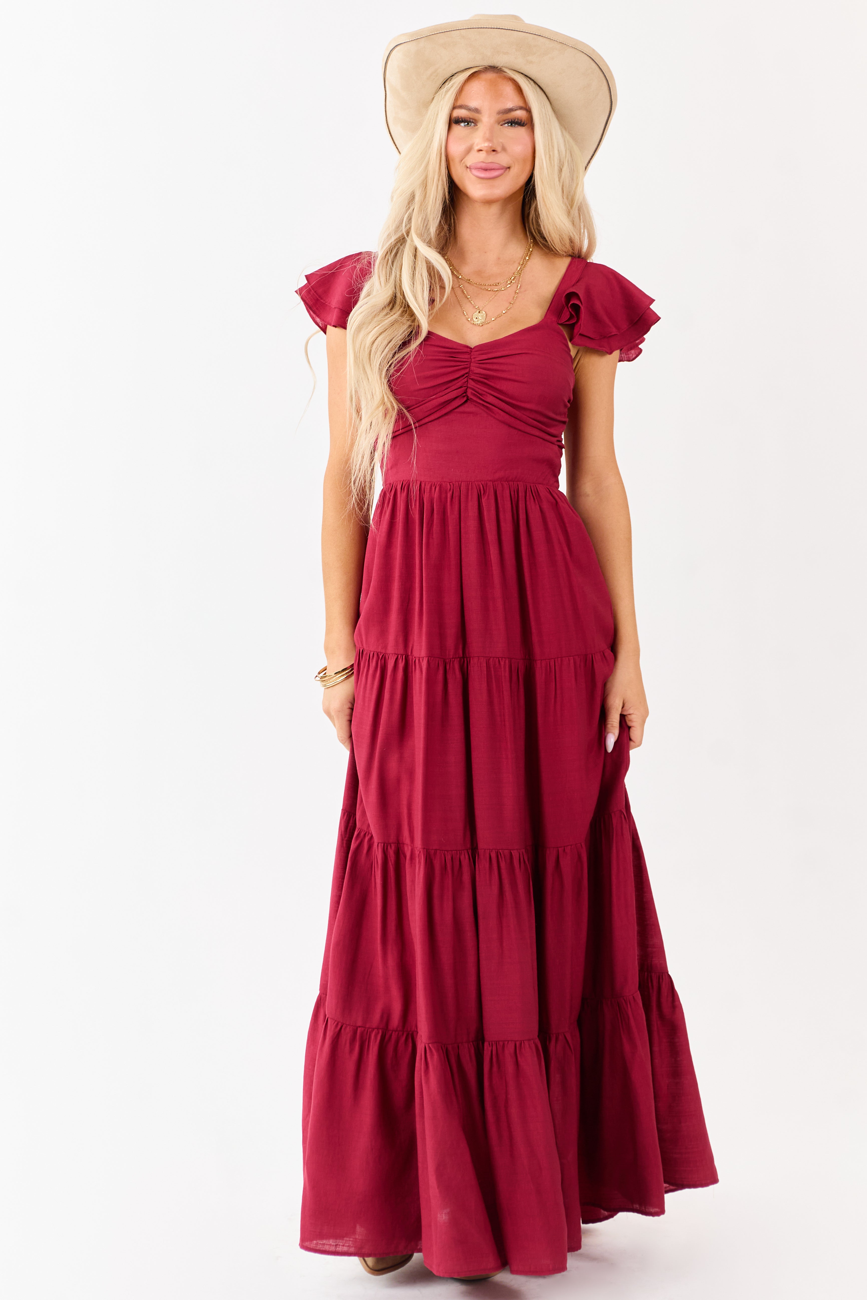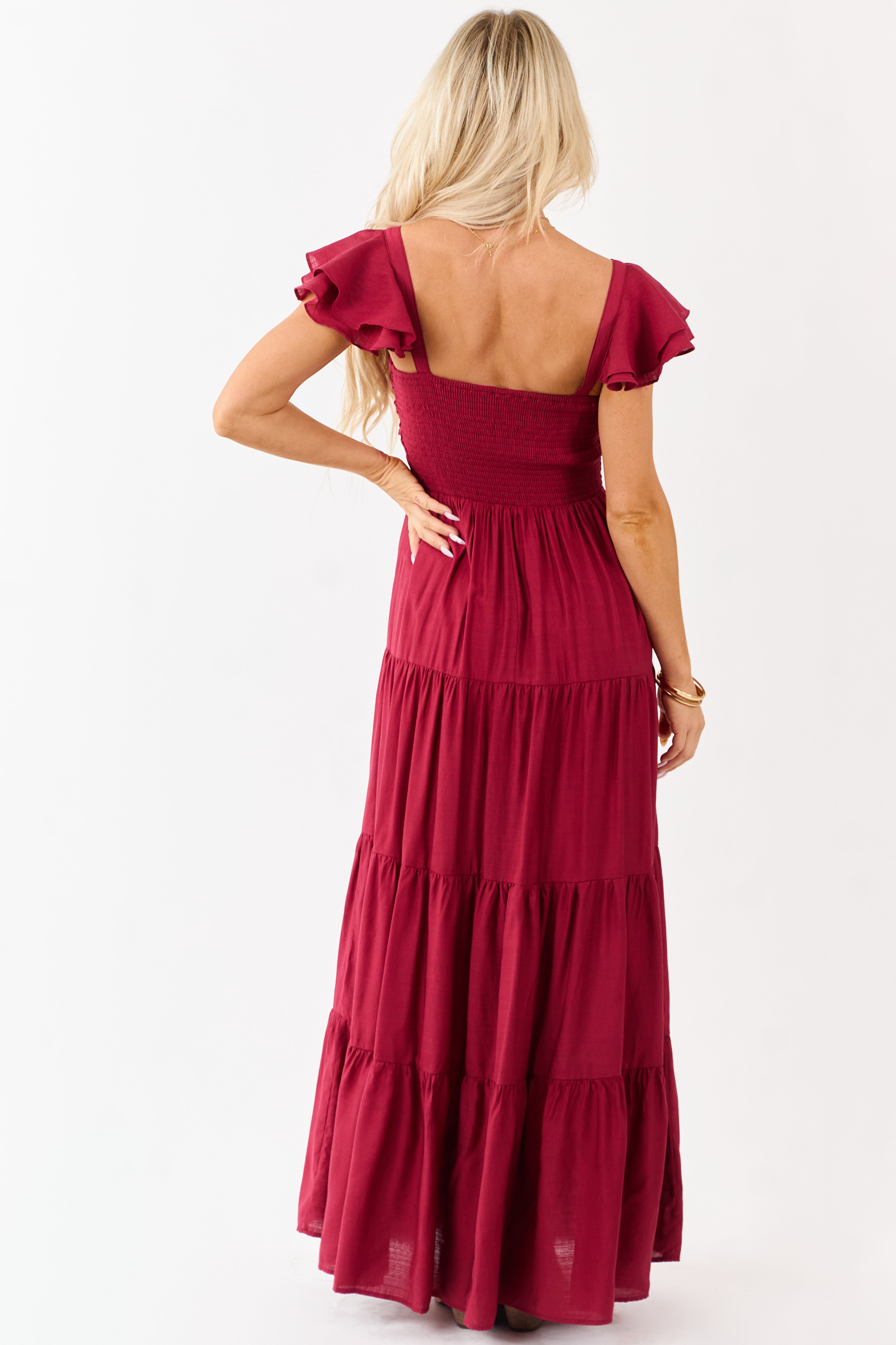 - A dreamy warm toned maxi with a tiered silhouette—complete with a sweetheart neckline and smocked back for comfort.