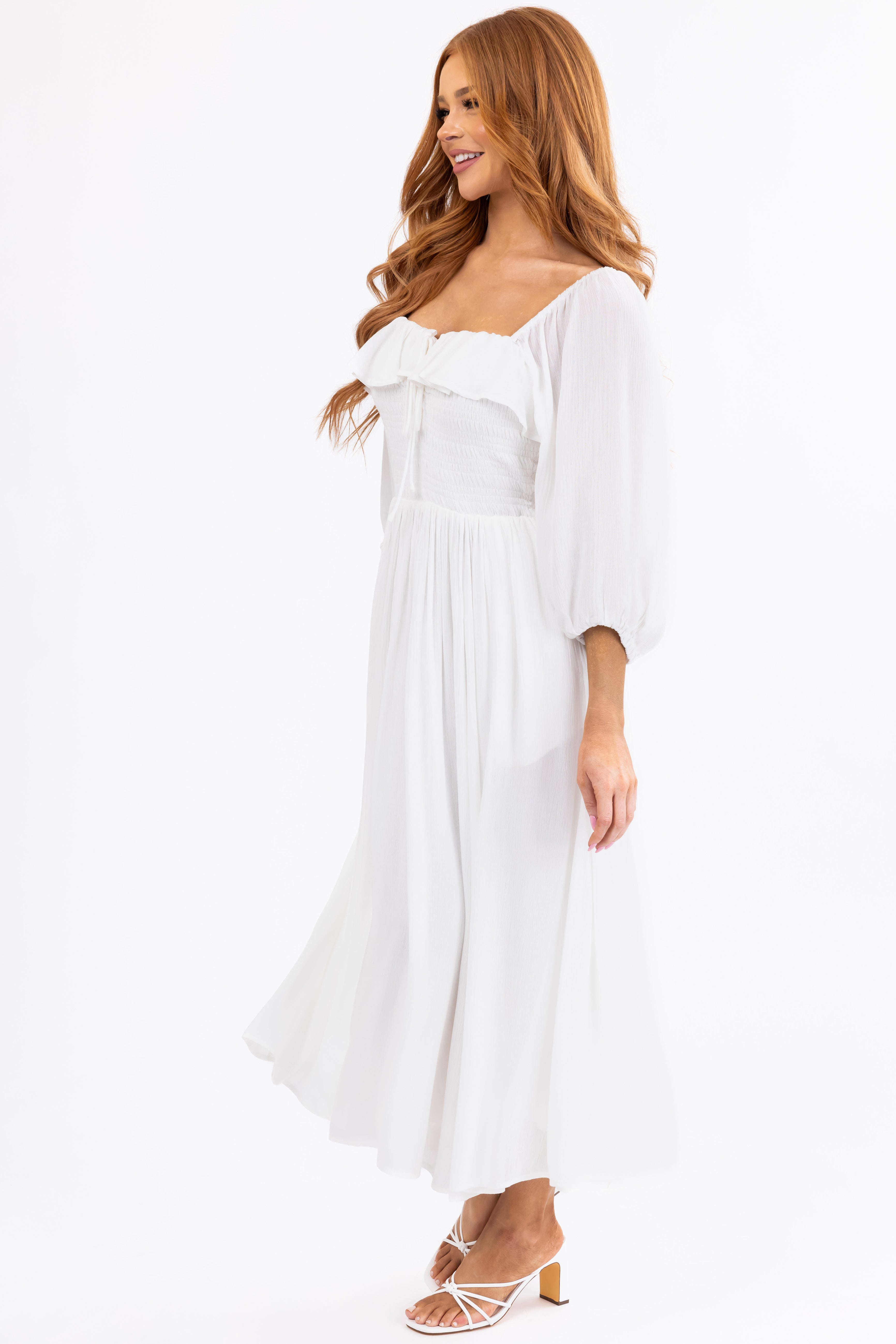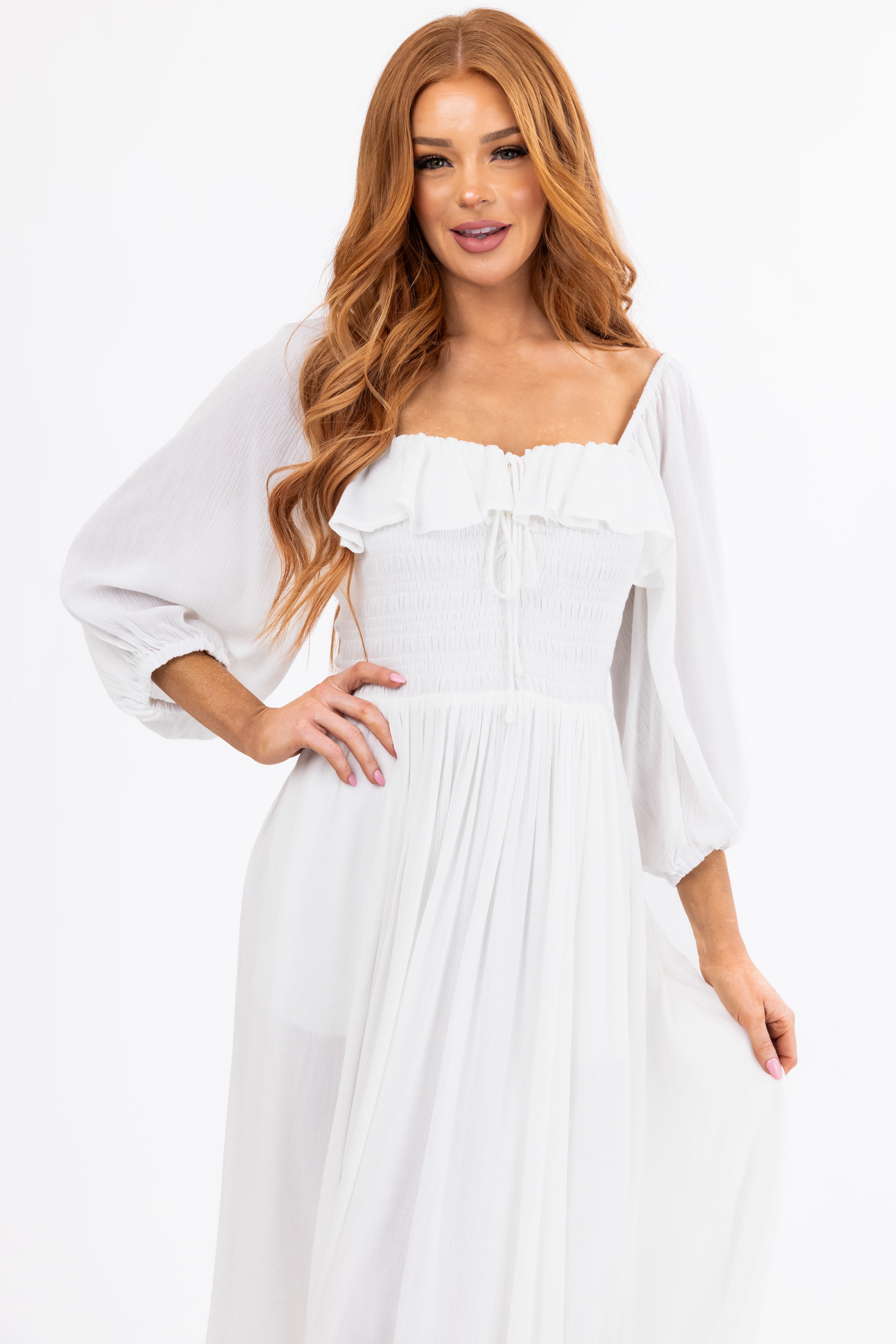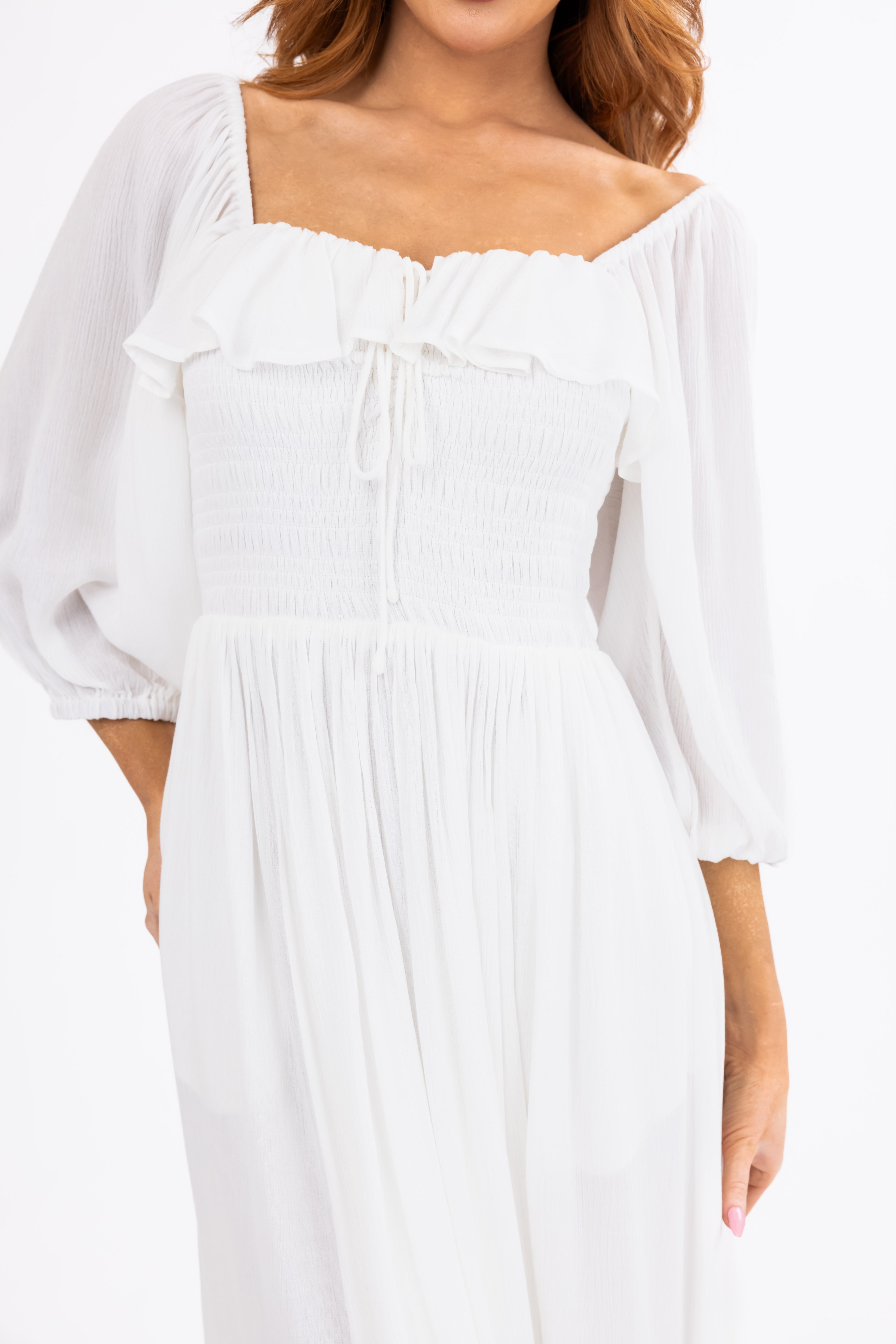 - Ruffle overlay on neckline
