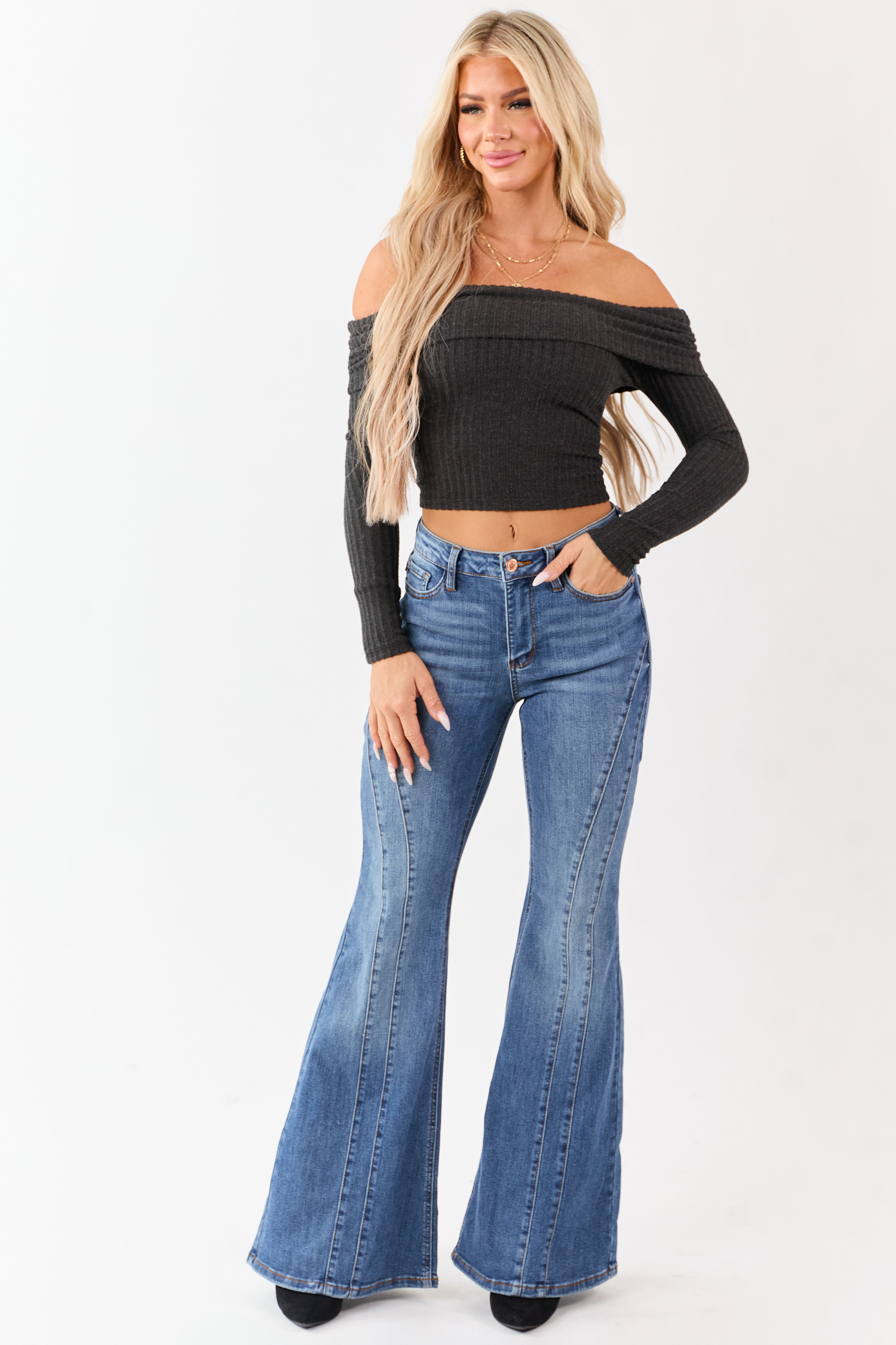 - Elevate your denim collection with these double angle seam flare jeans. Designed with a tall length. unique seam detailing. and a comfortable stretch.