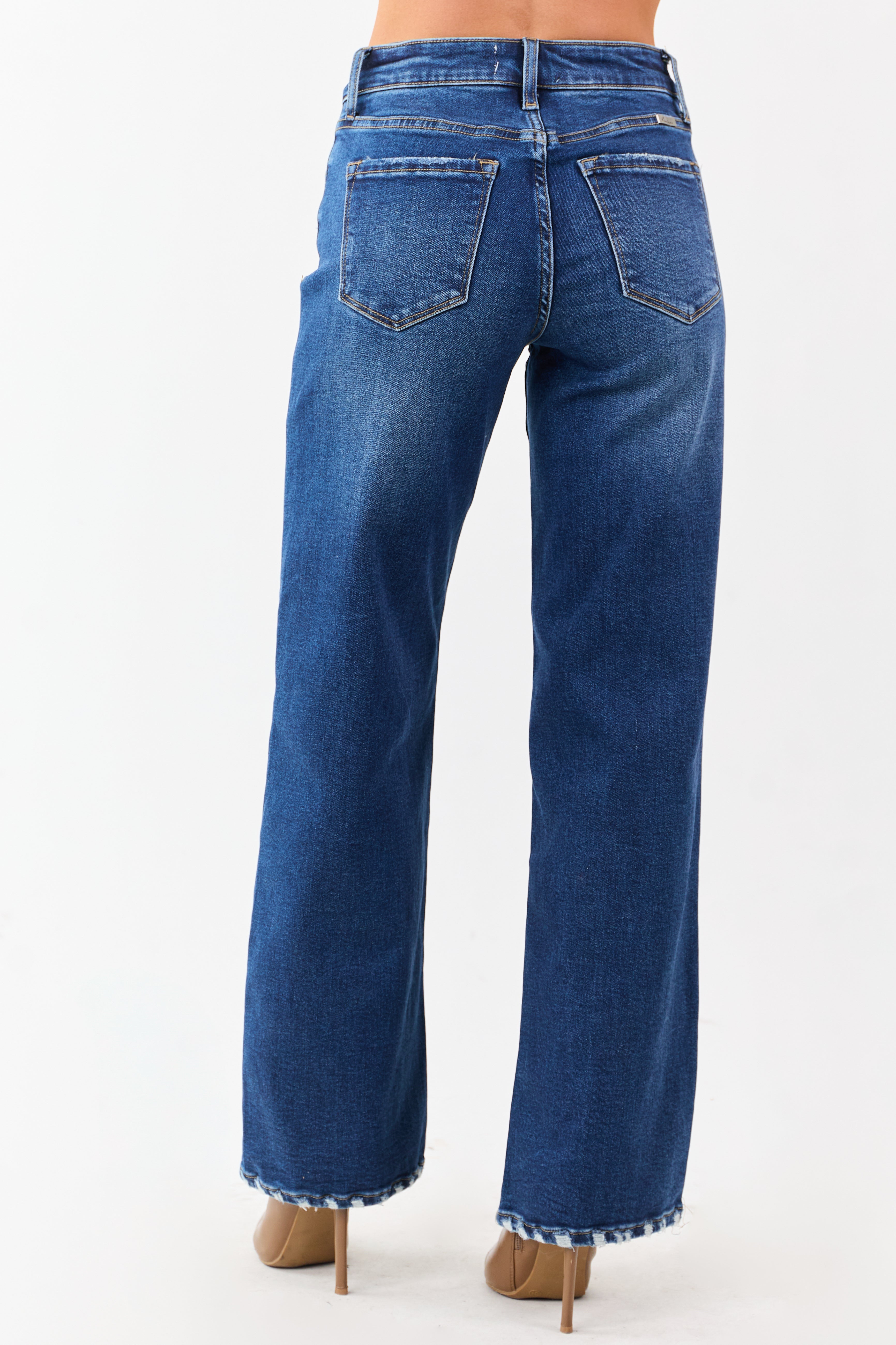 - Timeless dark wash denim with subtle distressing and a wide leg fit you'll love.