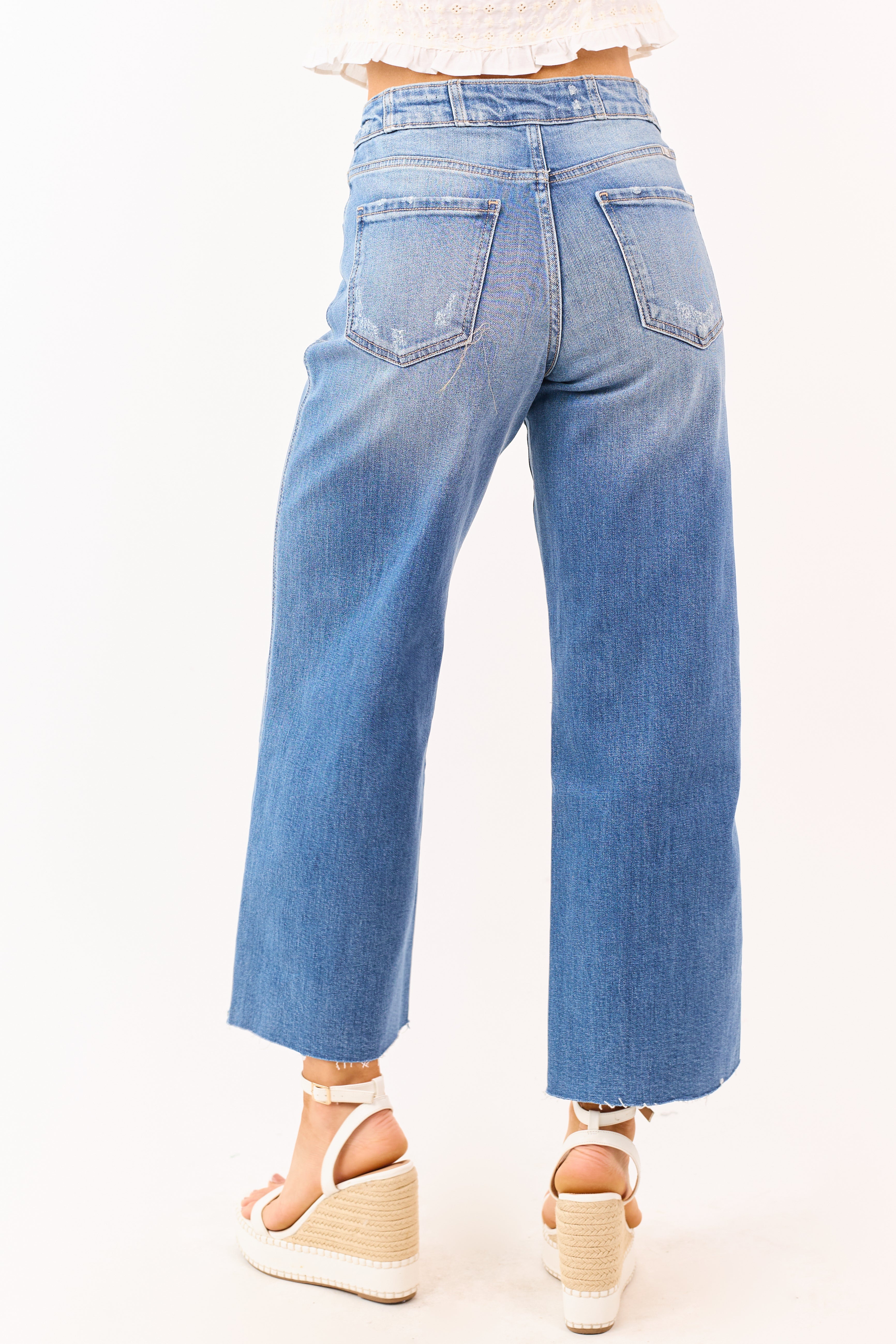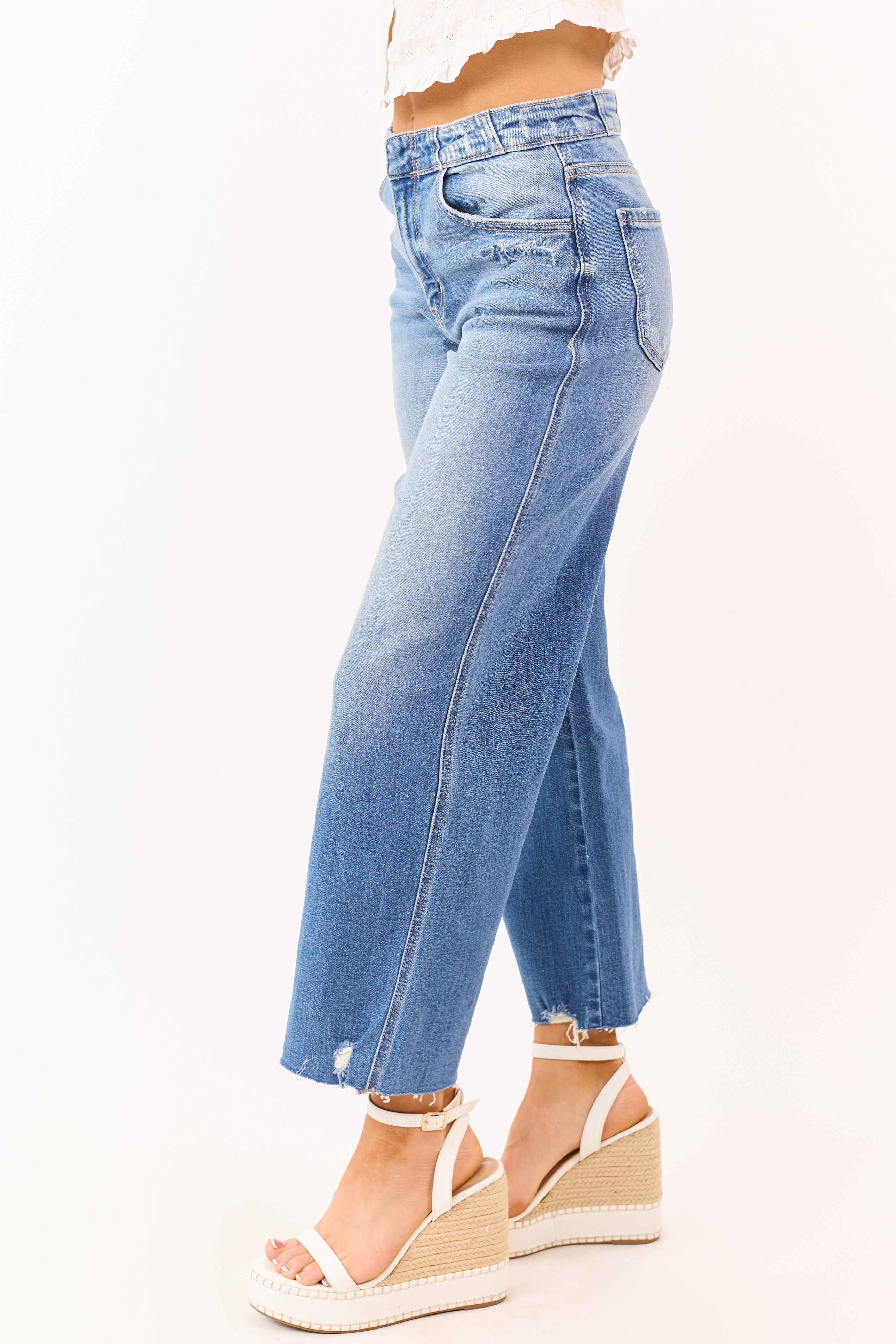 - Raw hems and gentle distressing give these medium wash jeans a lived-in vibe. while the wide leg cut keeps your silhouette comfortable and chic