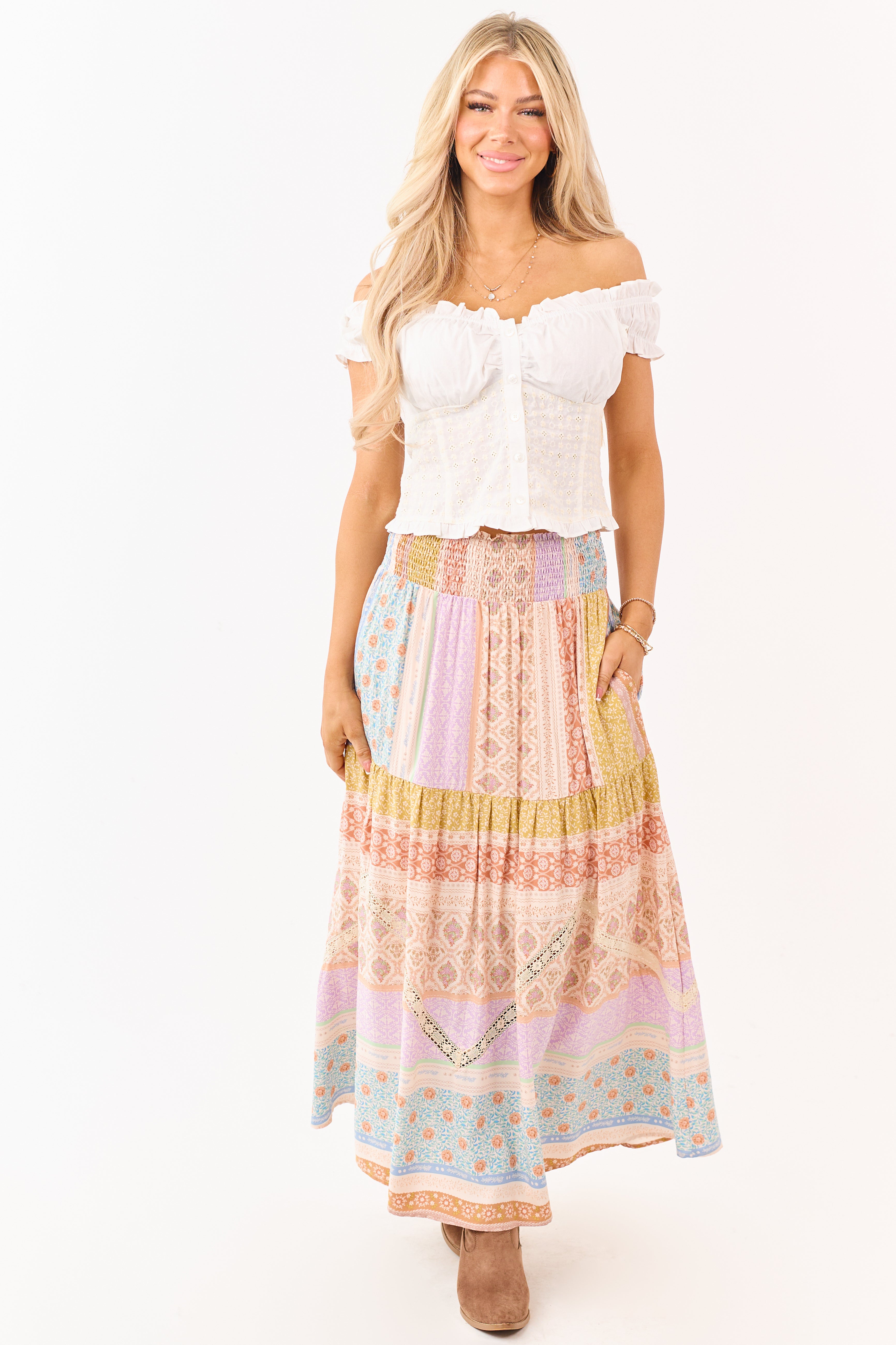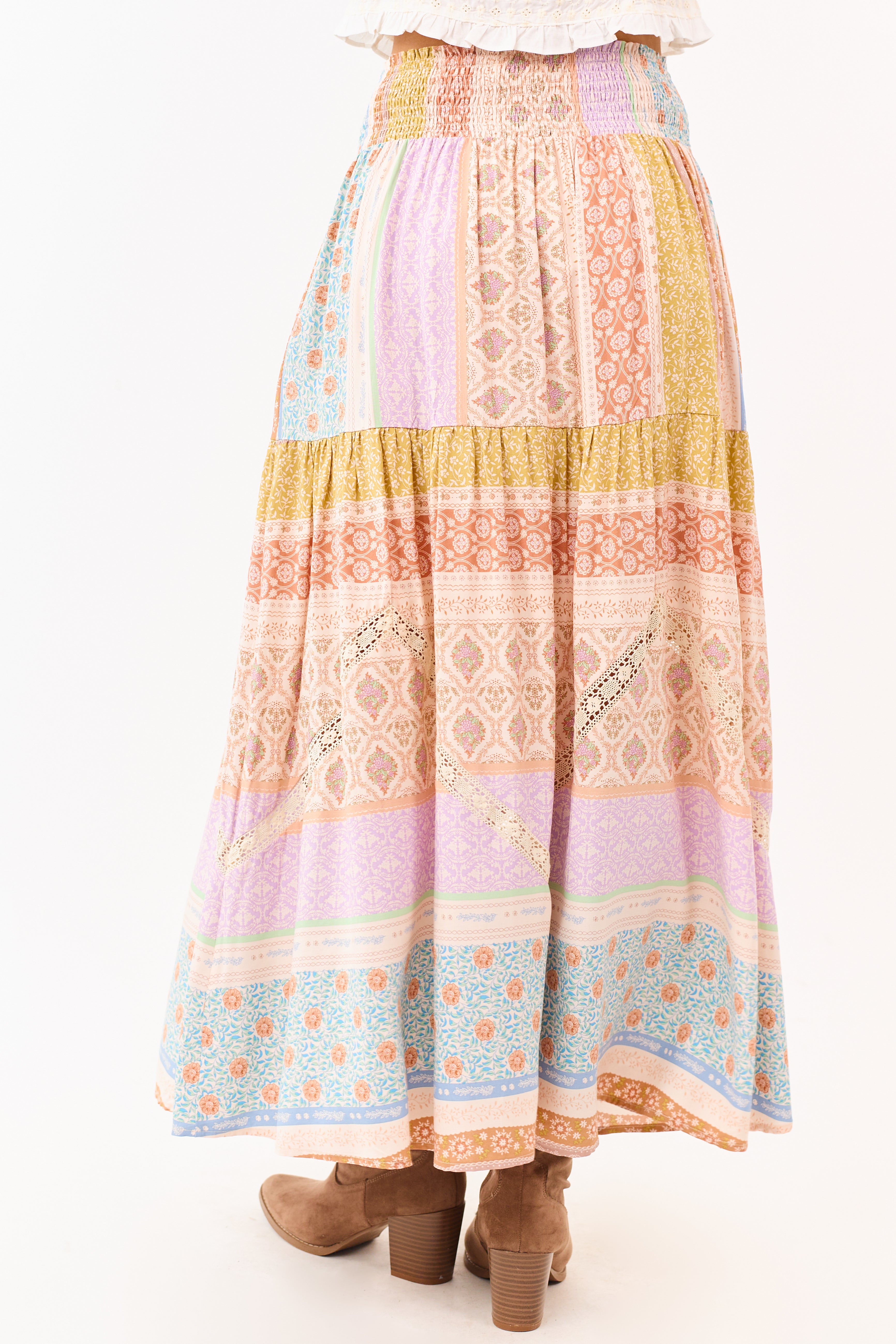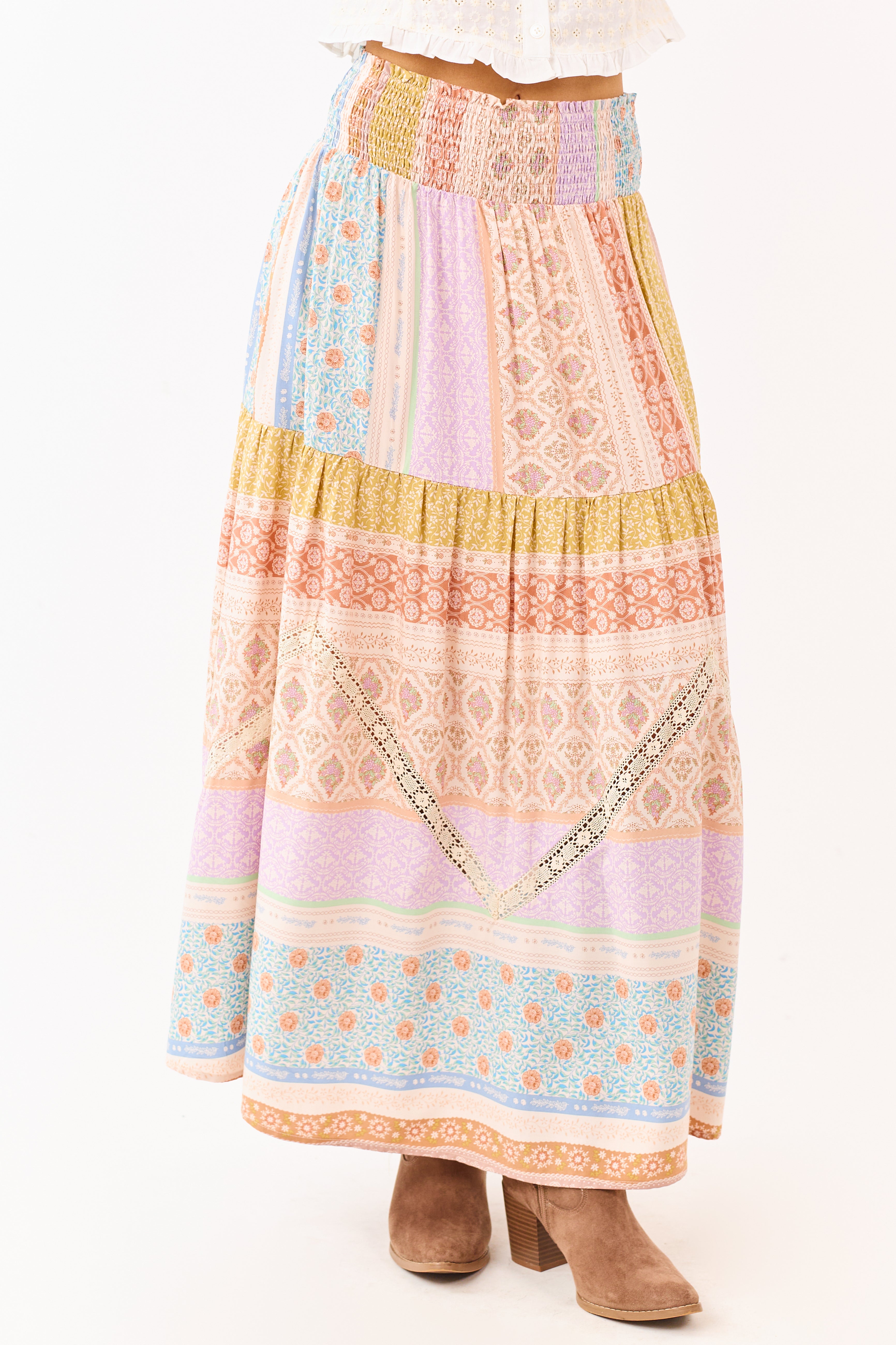 - A mix of floral patchwork gives this colorful maxi skirt its boho charm. finished with a comfortable smocked waistband