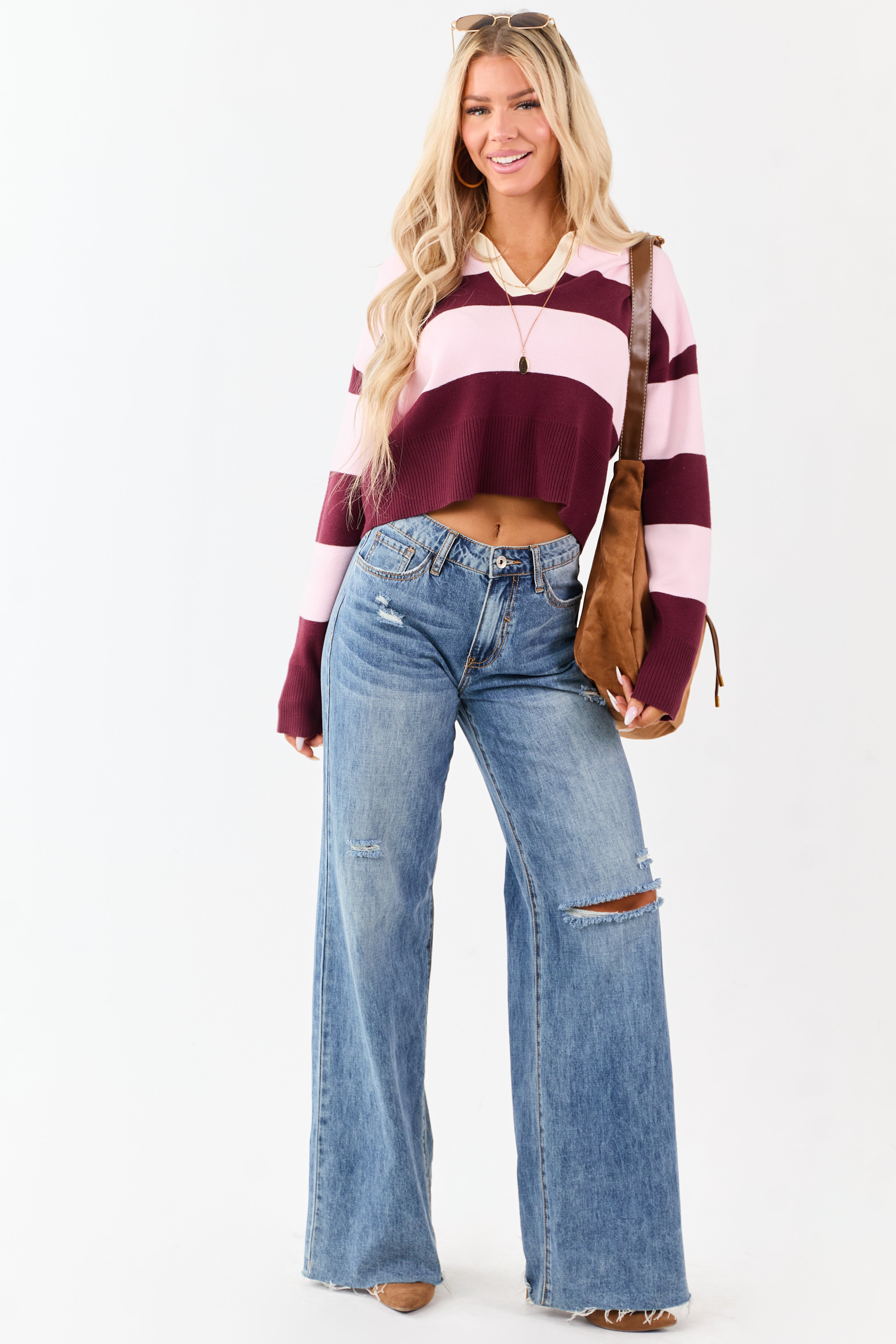 - Sporty meets chic in this striped rugby-style sweater. designed with a collared V-neck and relaxed fit.