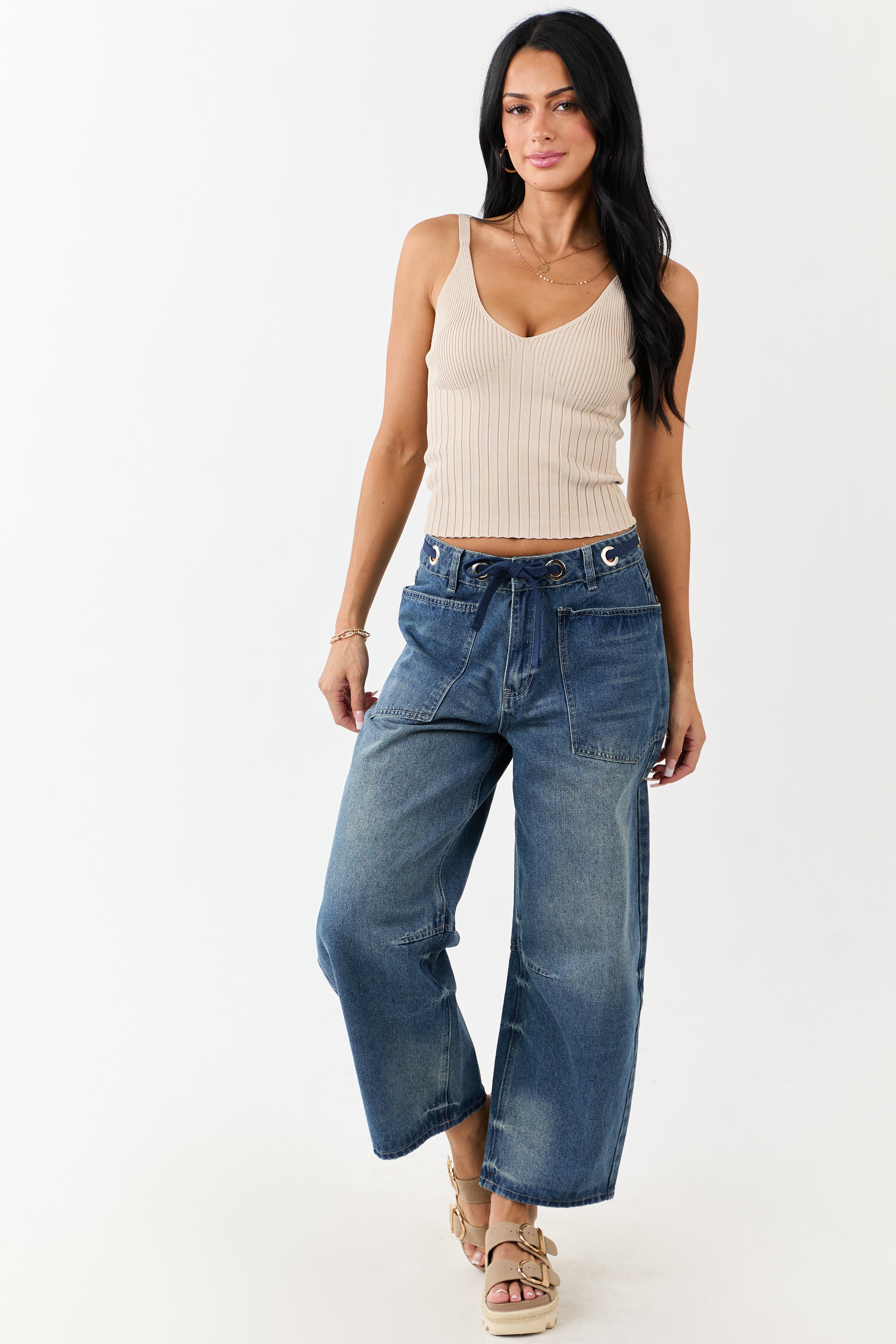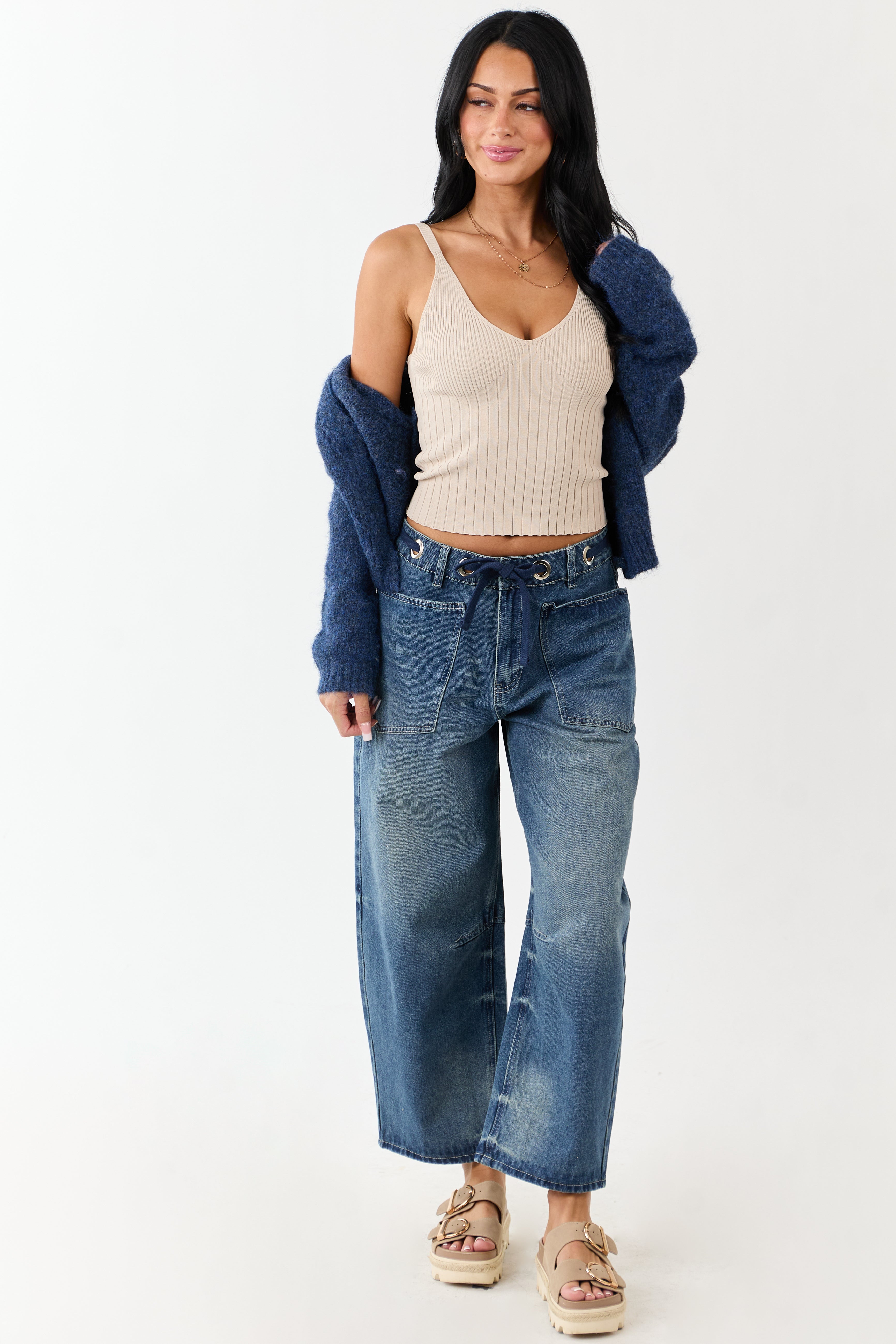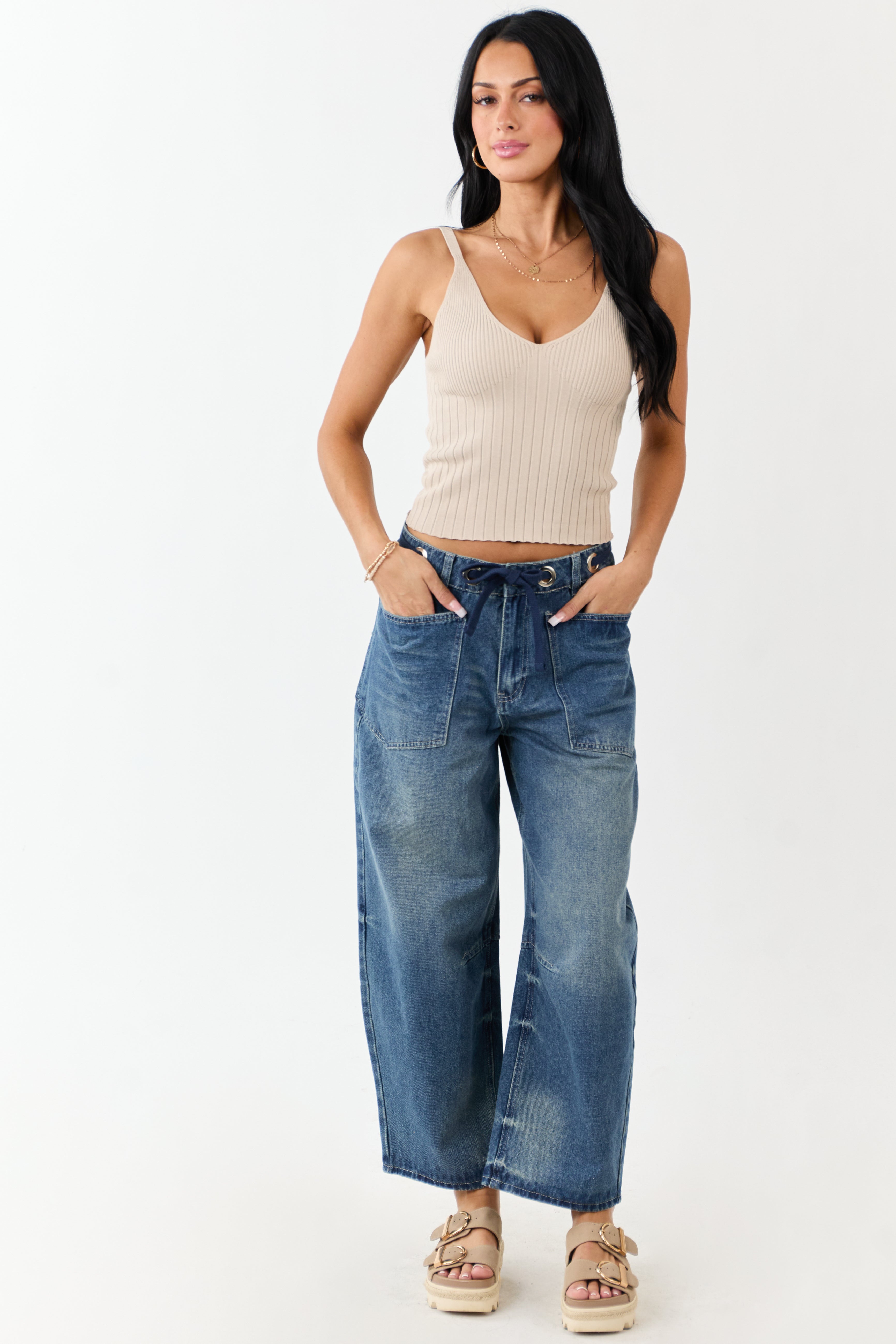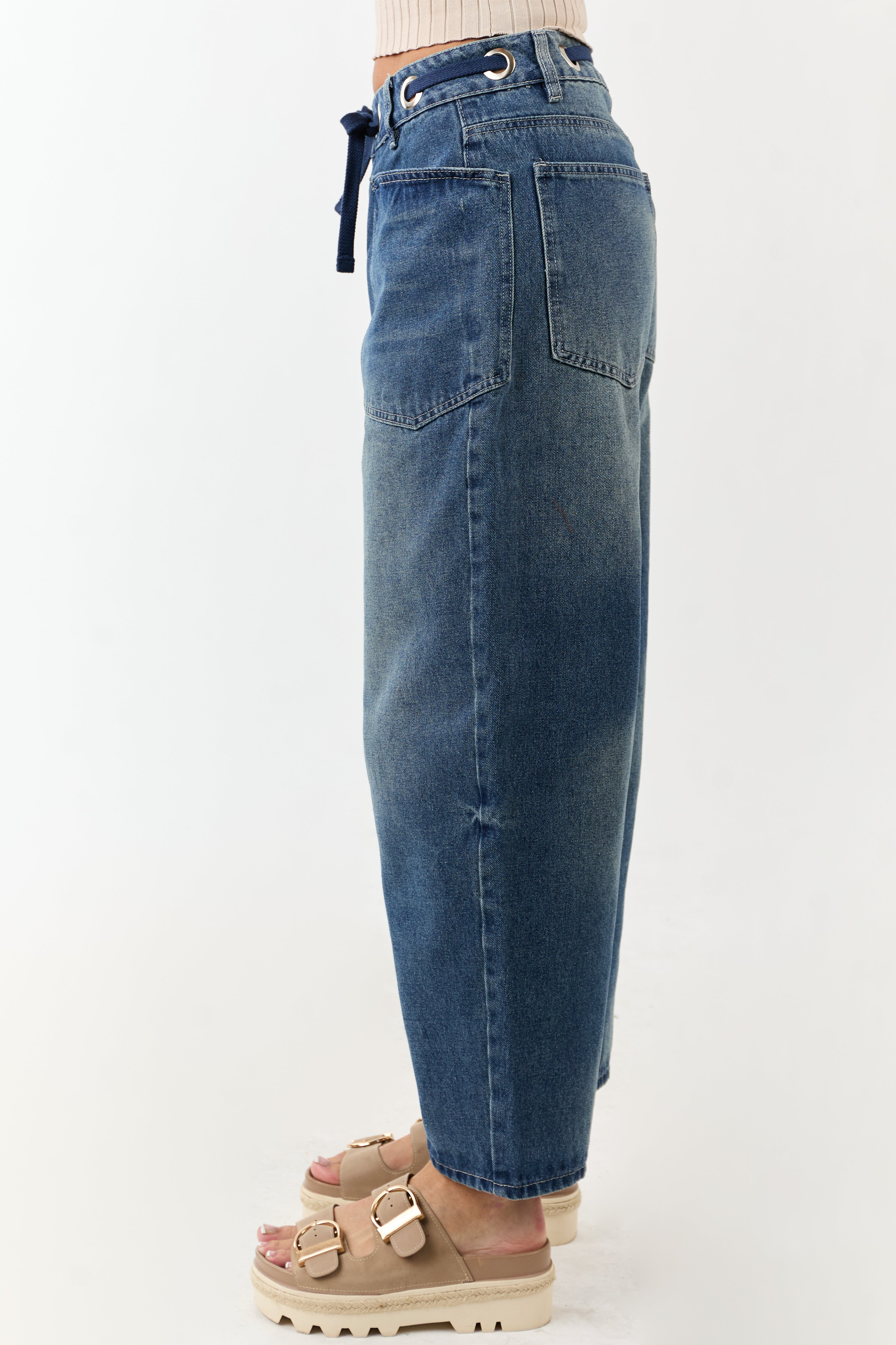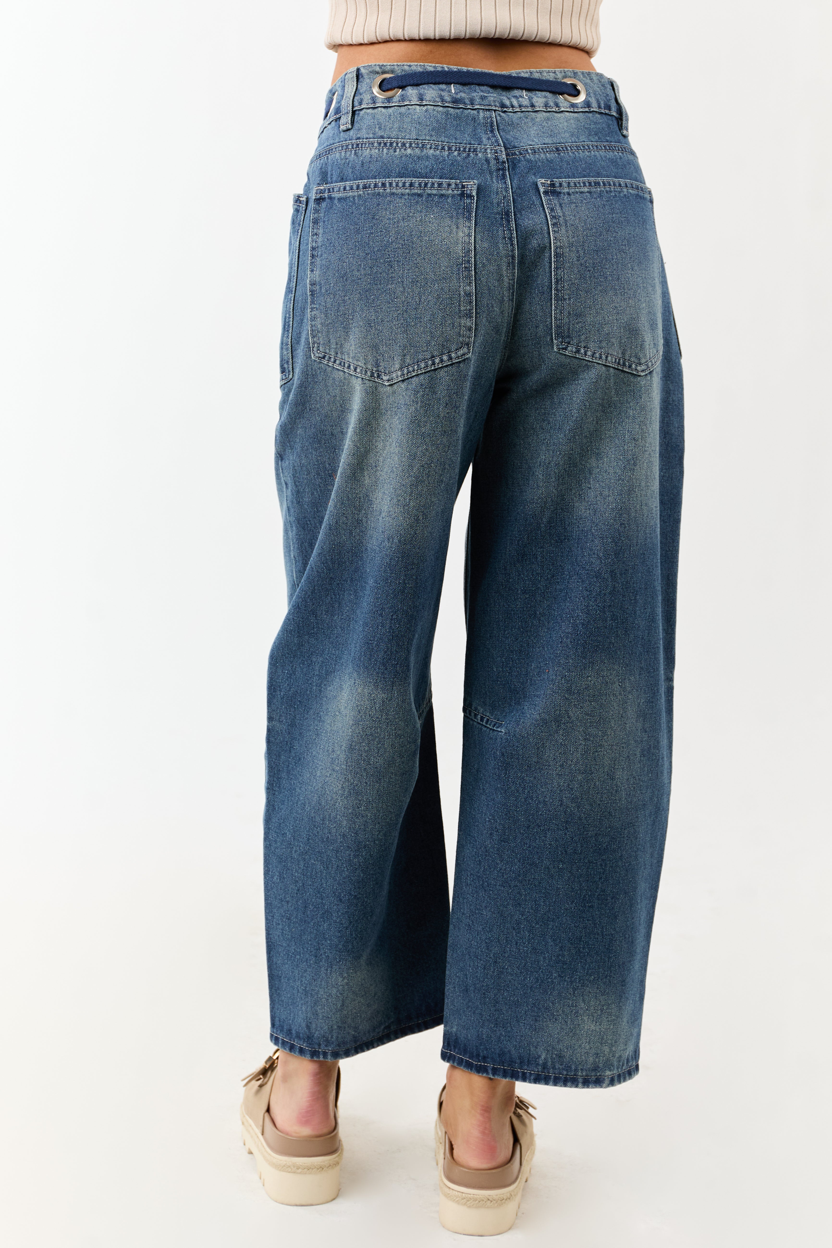 - These denim jeans have a relaxed barrel fit with and adjustable drawstring grommet waistband.