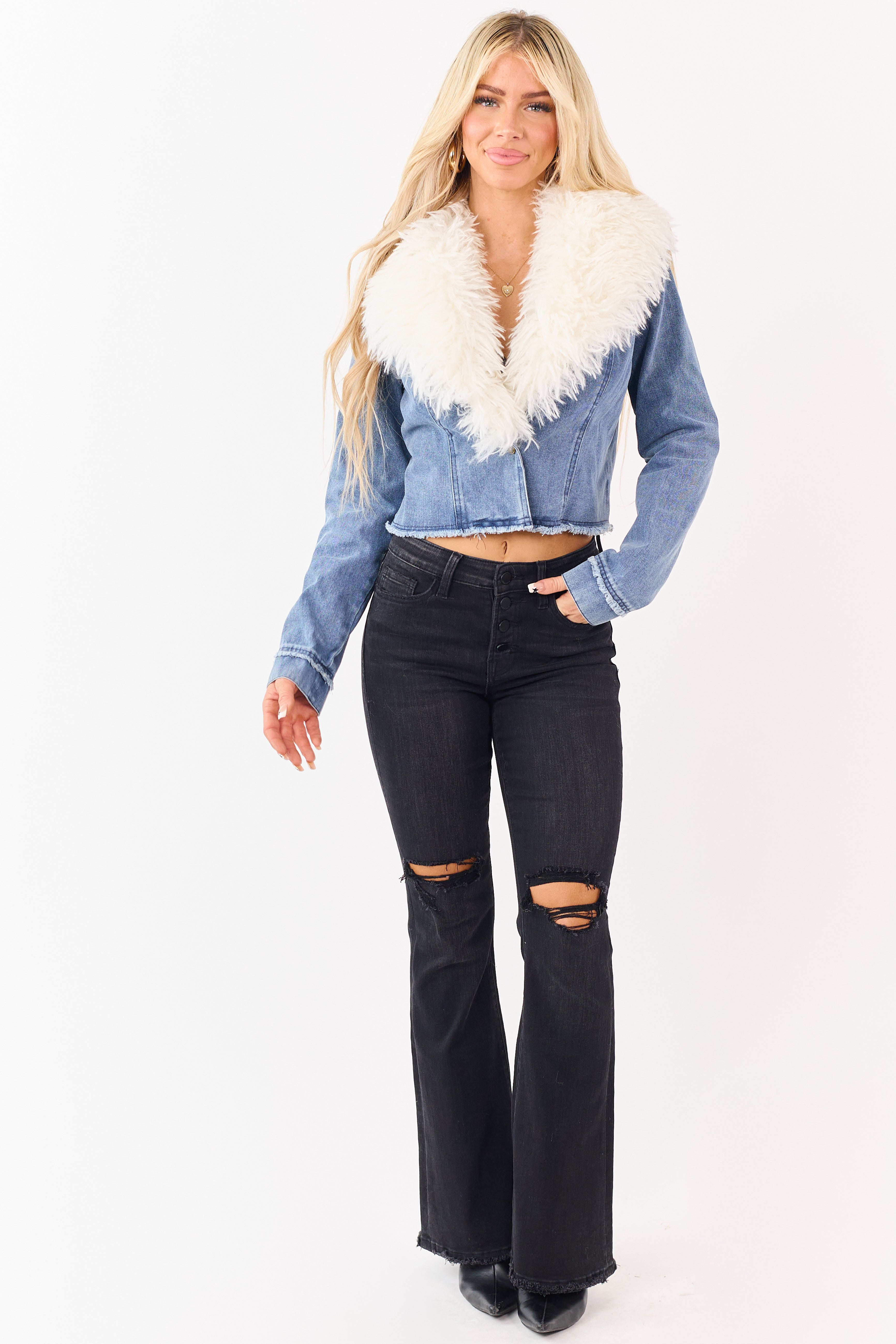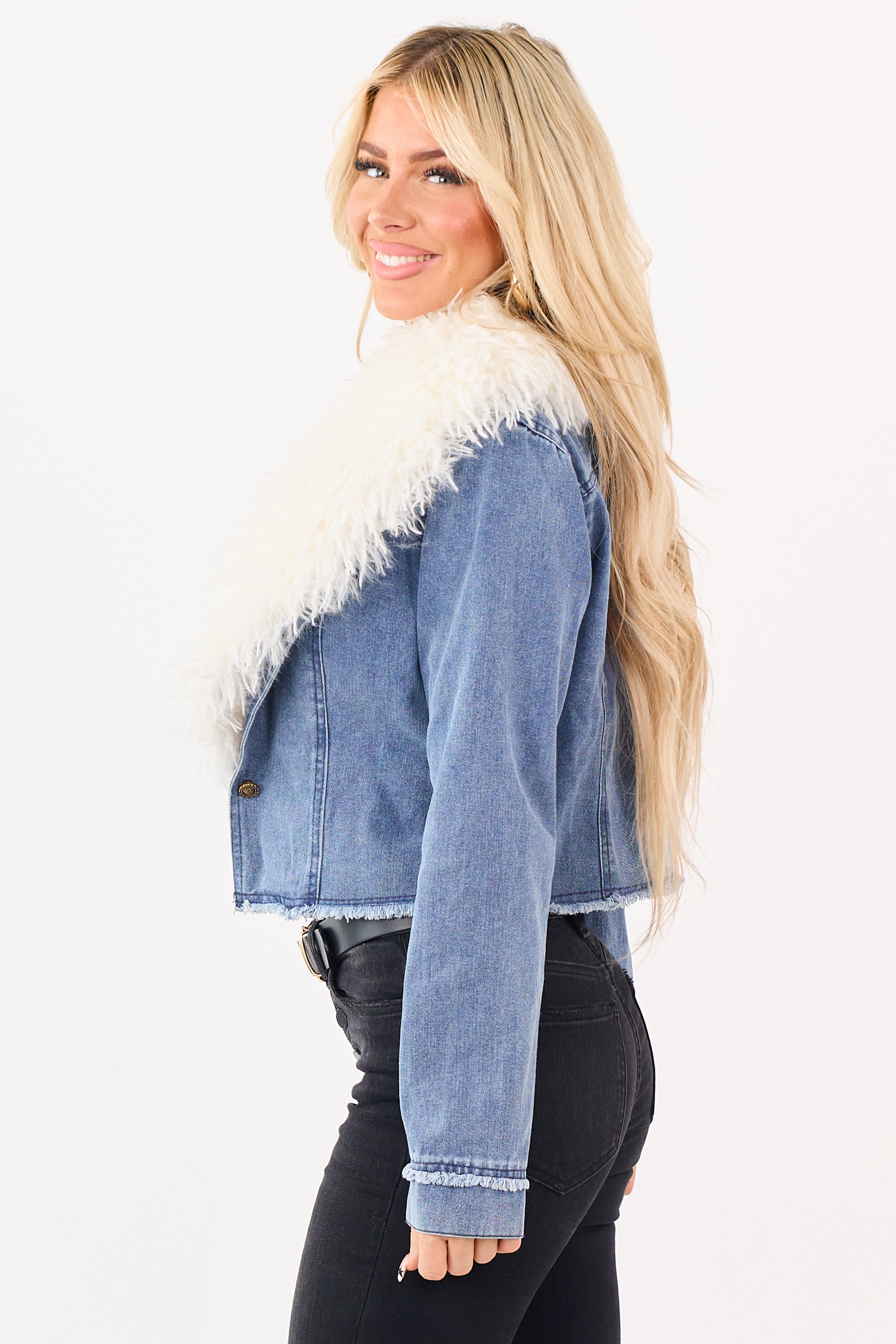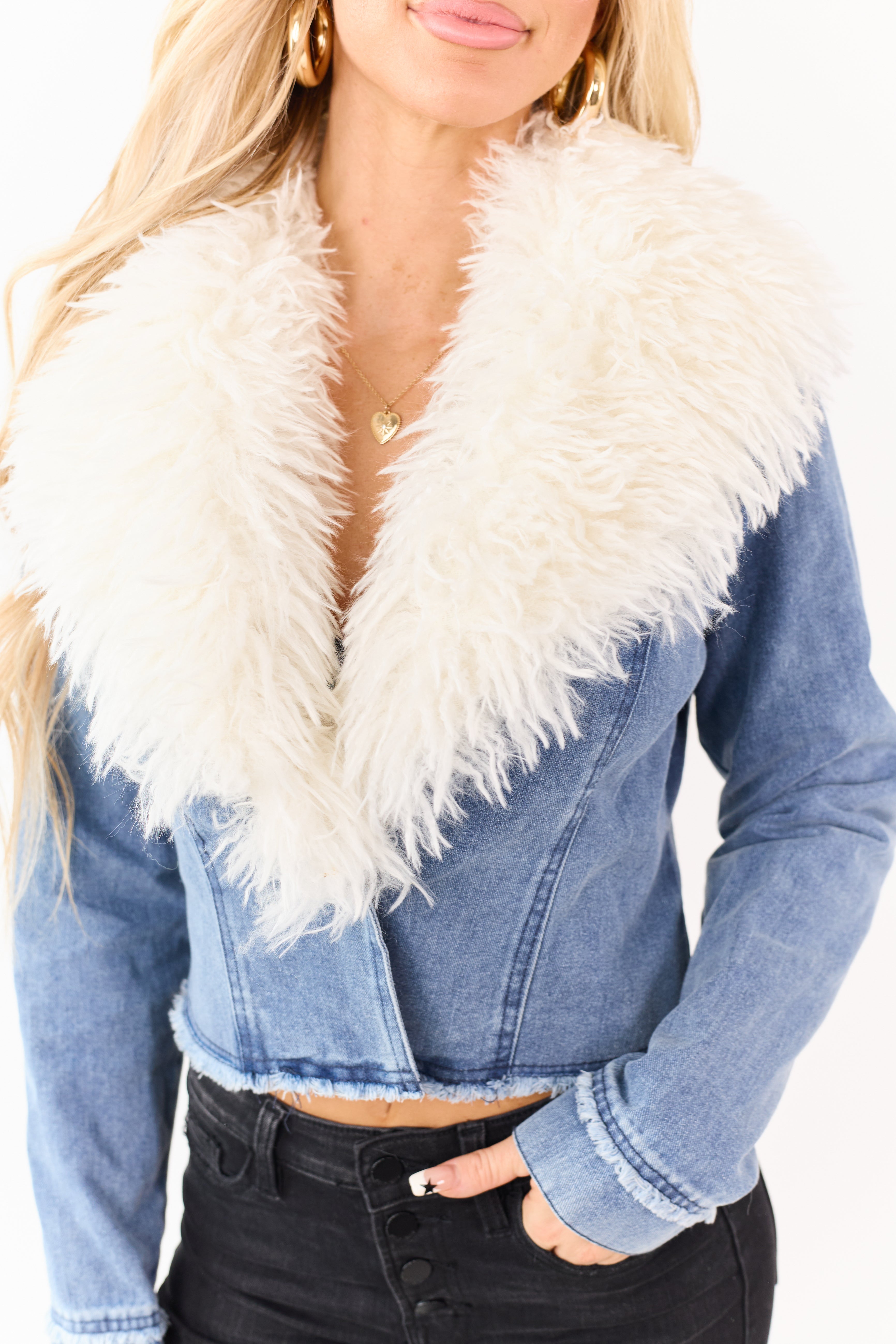 - This medium wash denim jacket gets a winter-ready upgrade with a plush faux fur collar for the perfect mix of cozy and cool