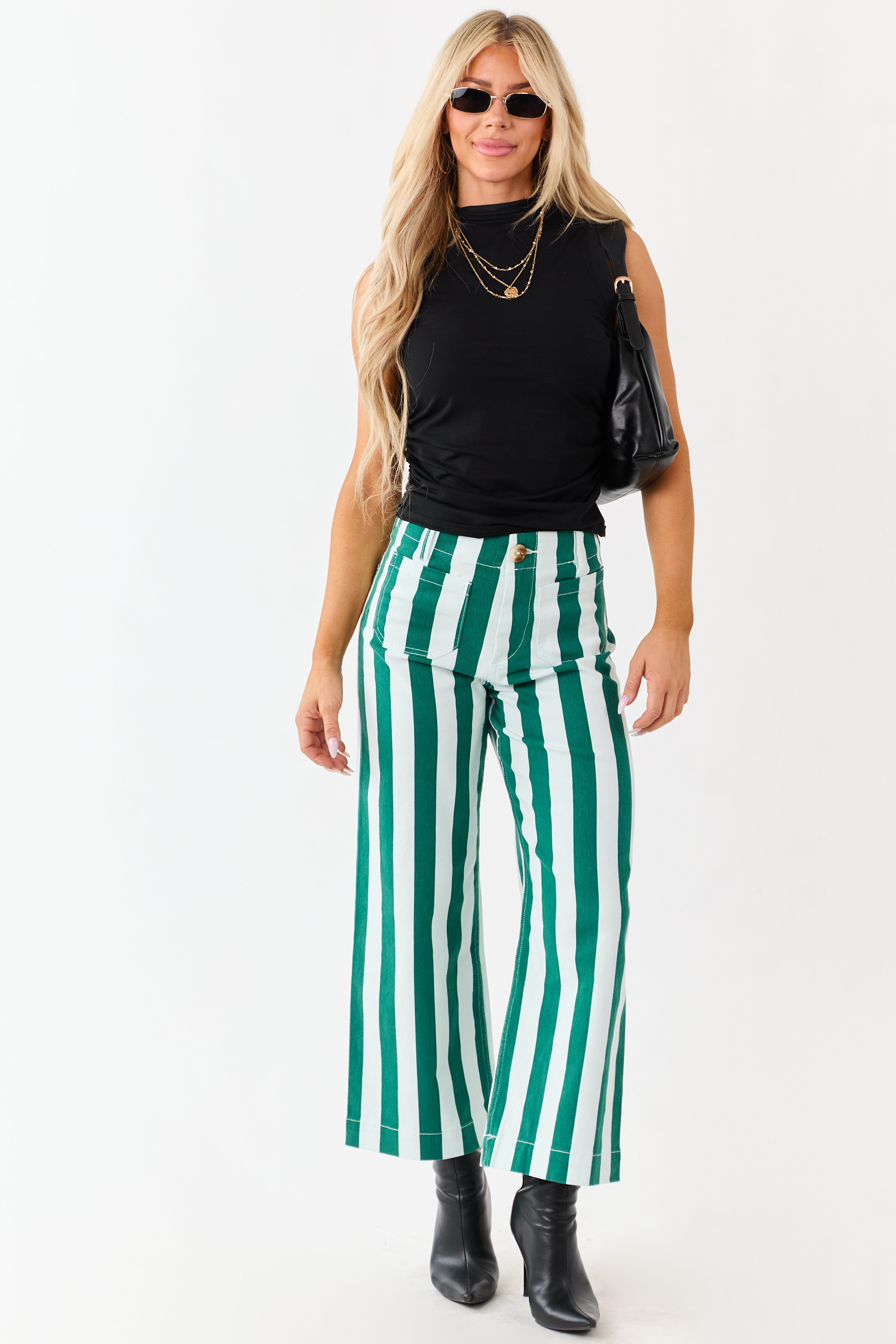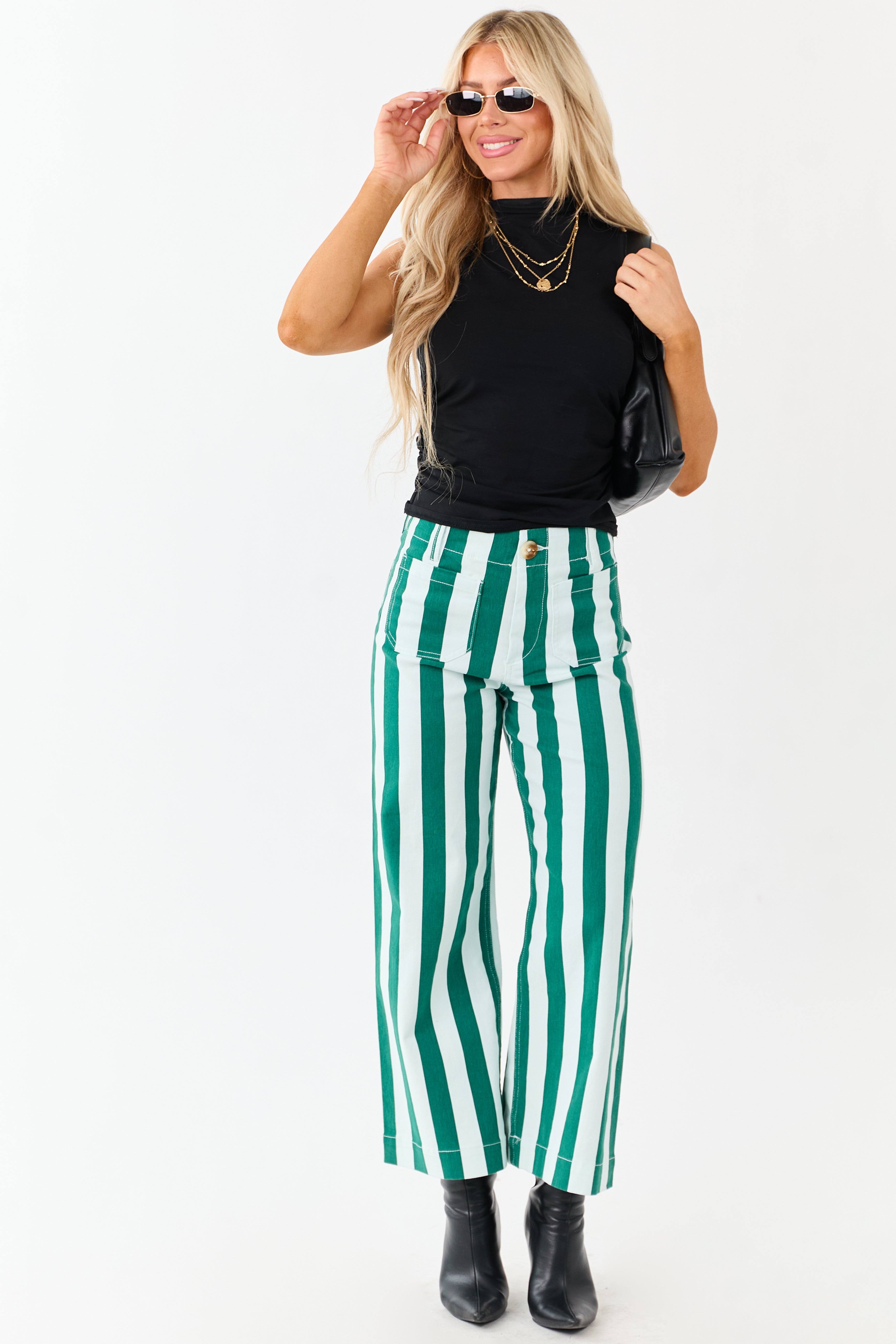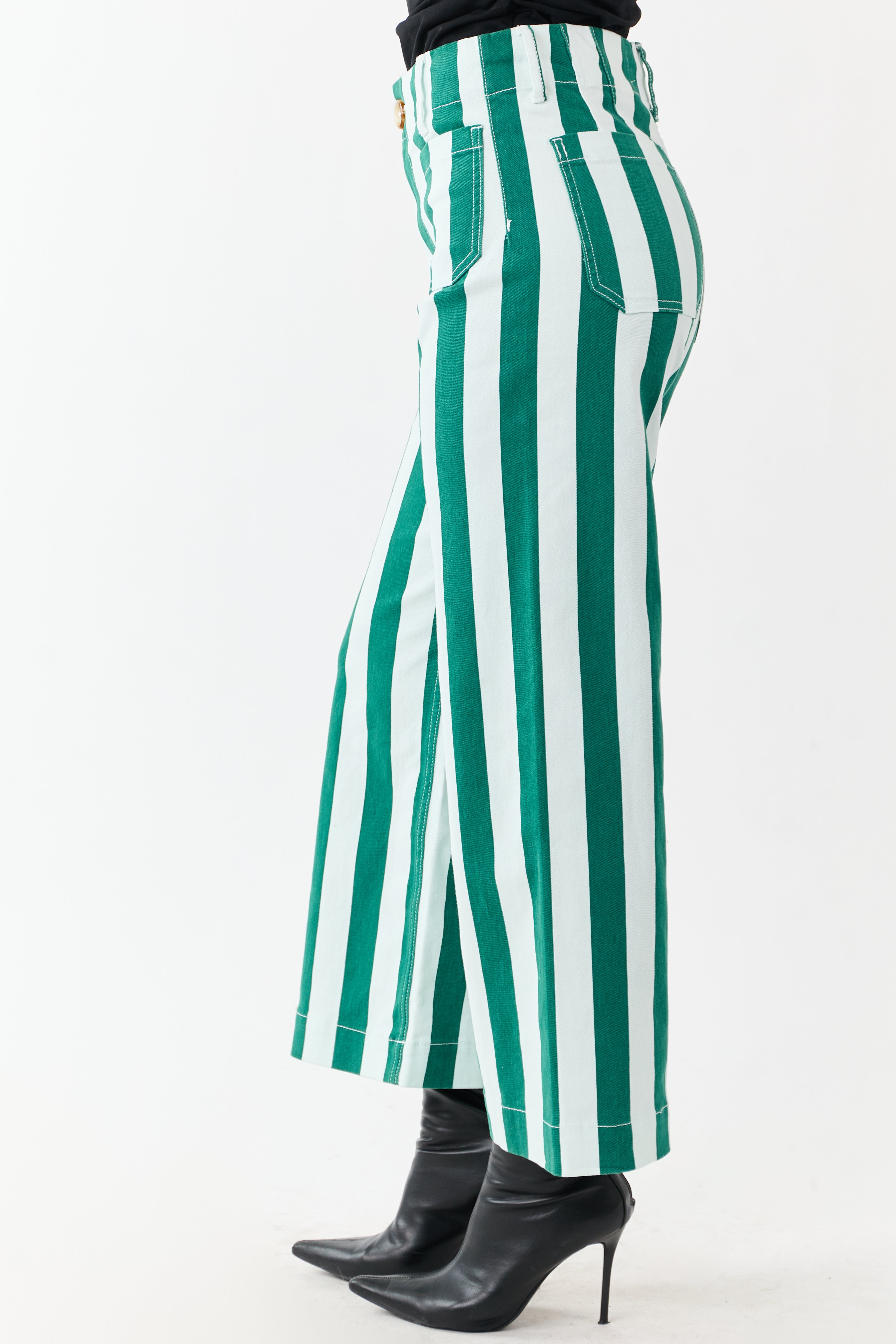 - Playful and bold. these striped wide leg jeans feature a flattering fit. stretchy comfort. and front patch pockets.