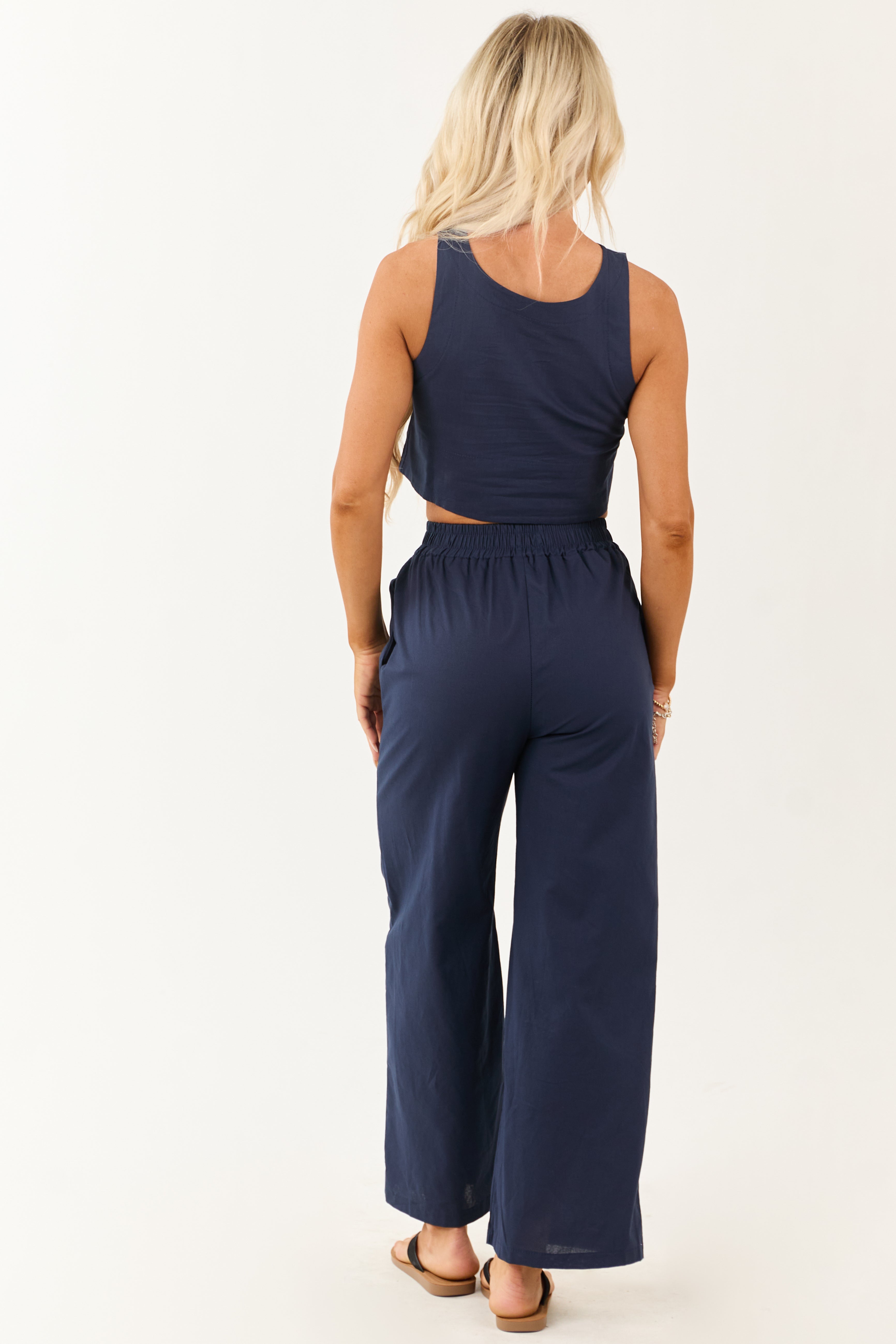 - Sun-soaked style made easy—this two-piece set pairs a cropped tank with flowy wide leg pants for a bold. effortless look.