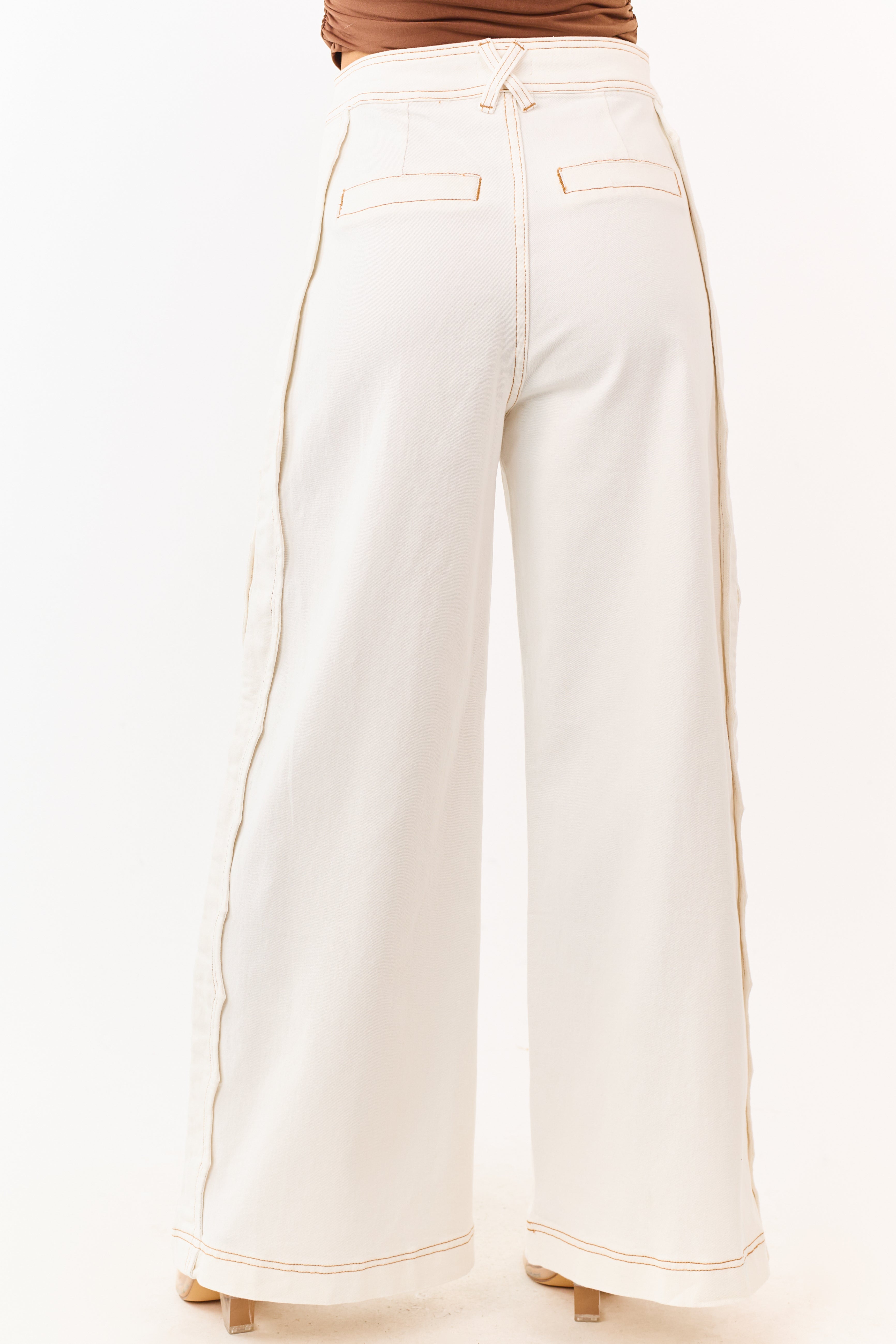 - A tailored wide leg silhouette meets delicate scalloped detailing and contrast stitching in these stretch denim jeans