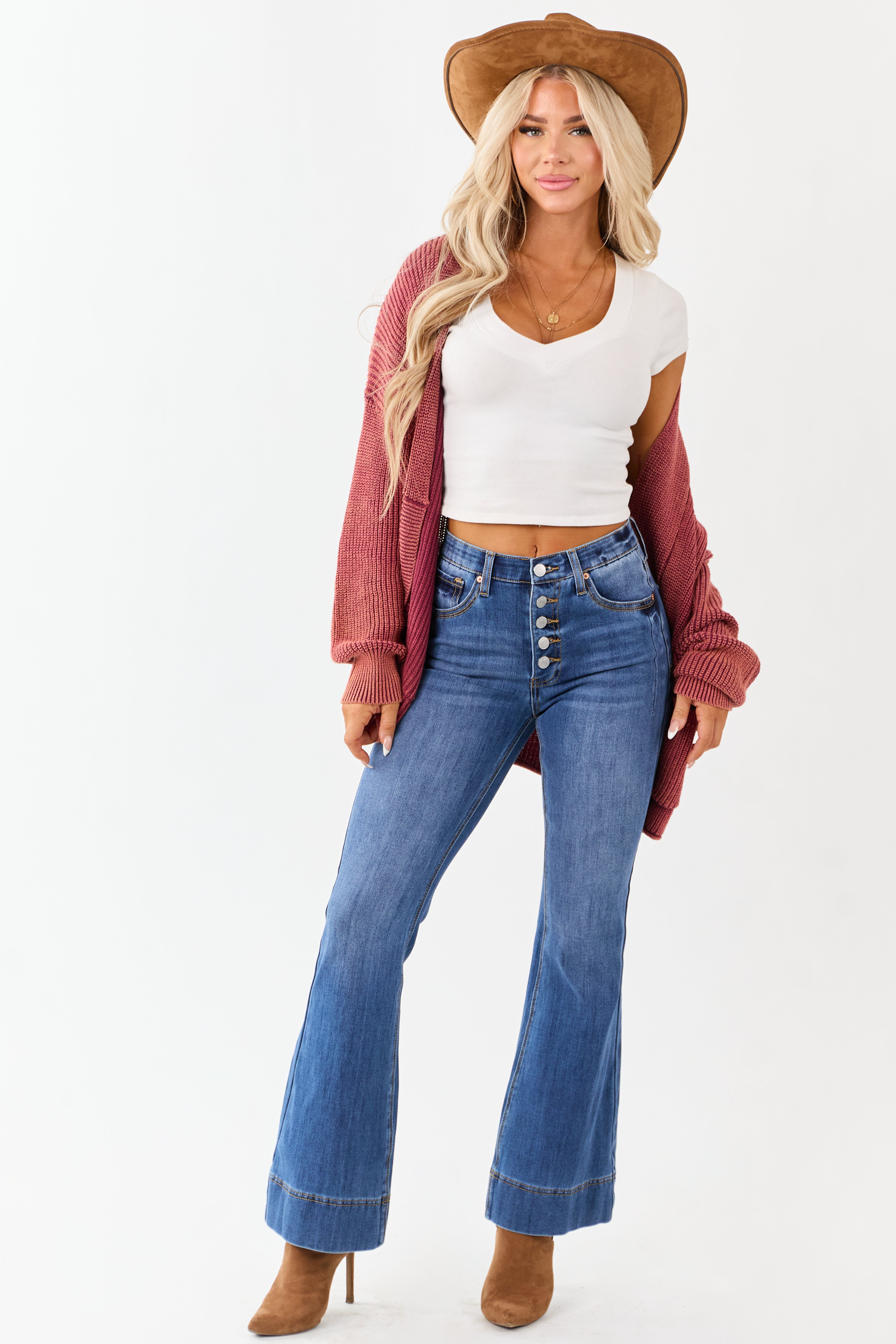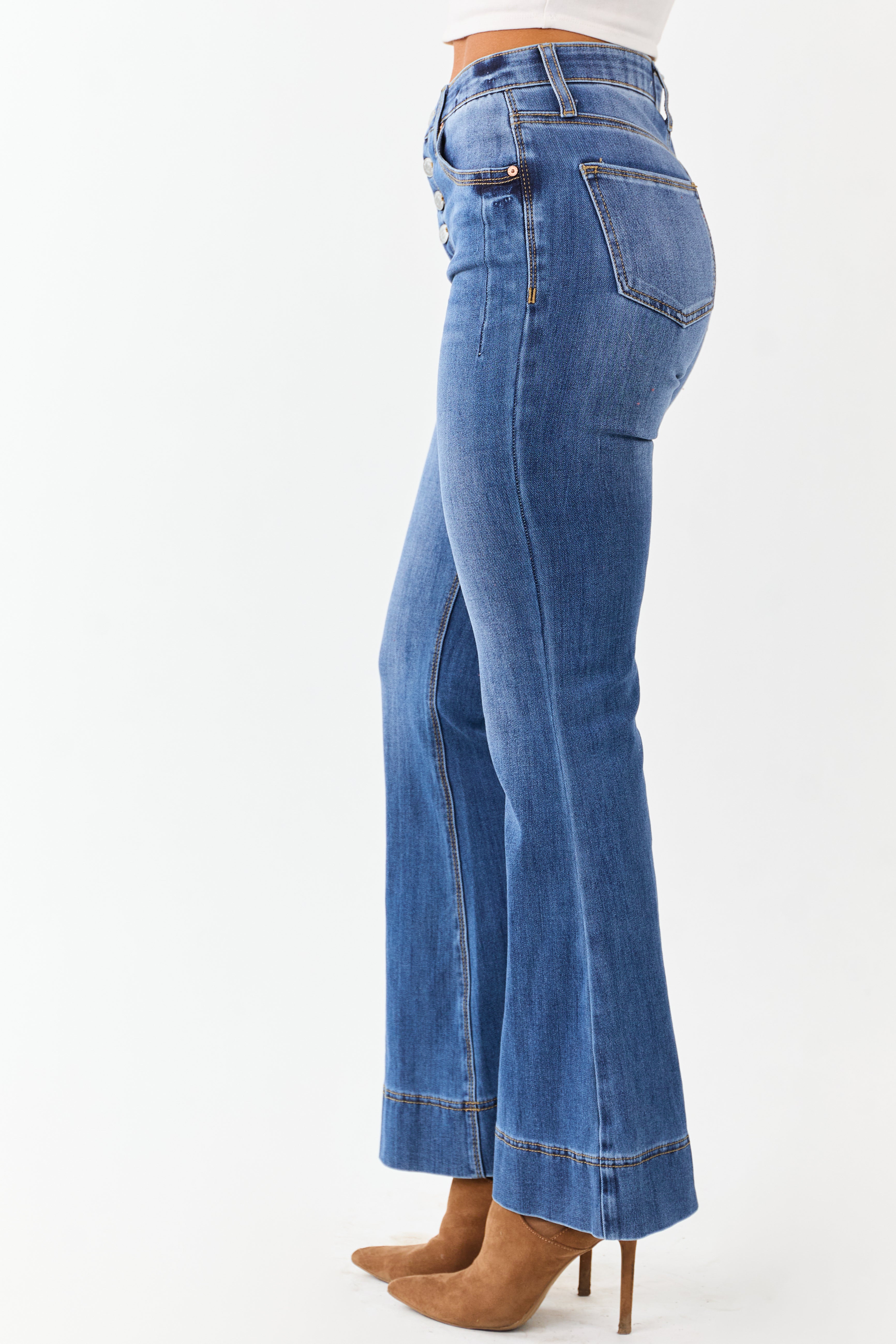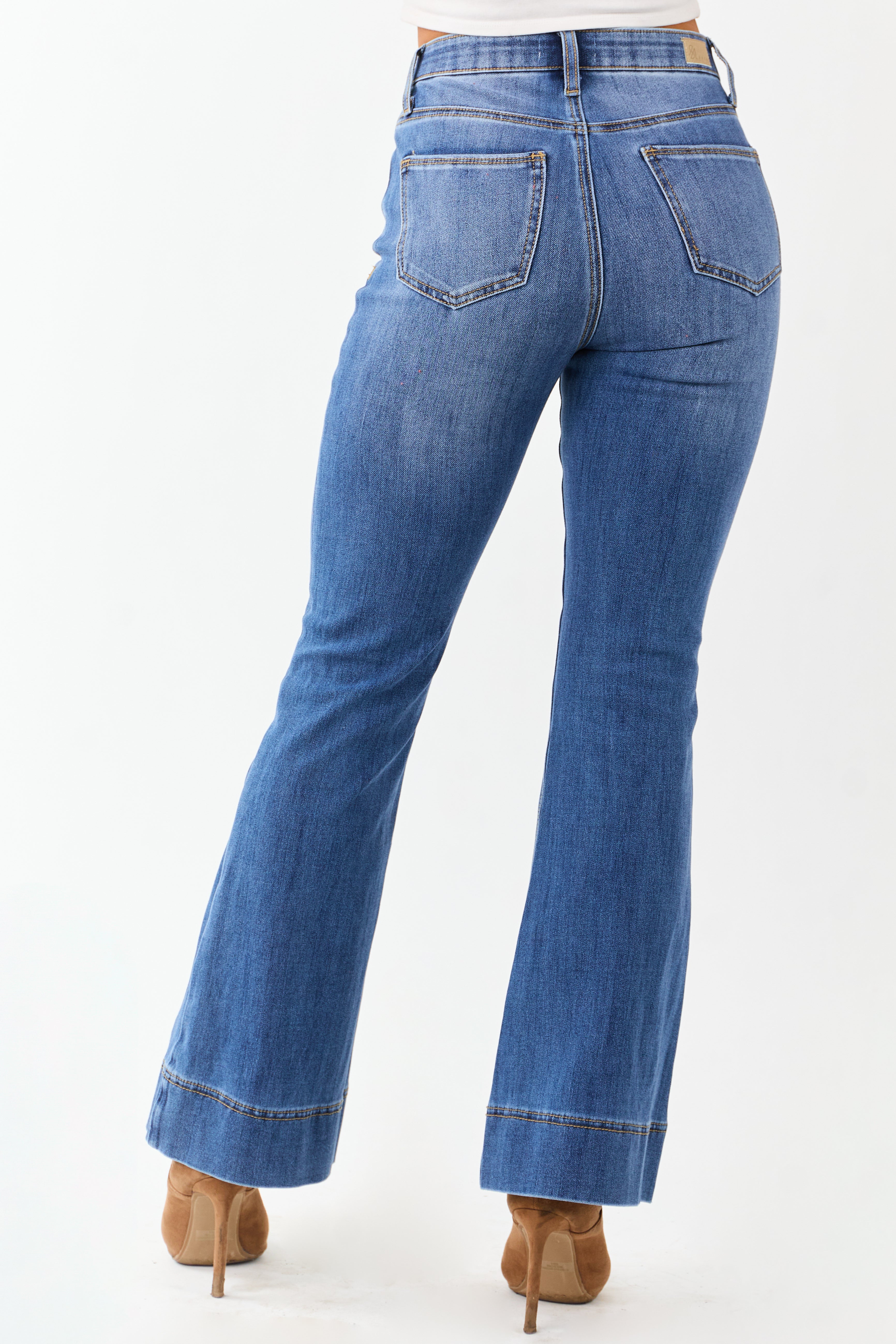 - Stretchy and sculpting. these dark wash flare jeans feature a button fly and tummy control design that hugs your curves in all the right places.