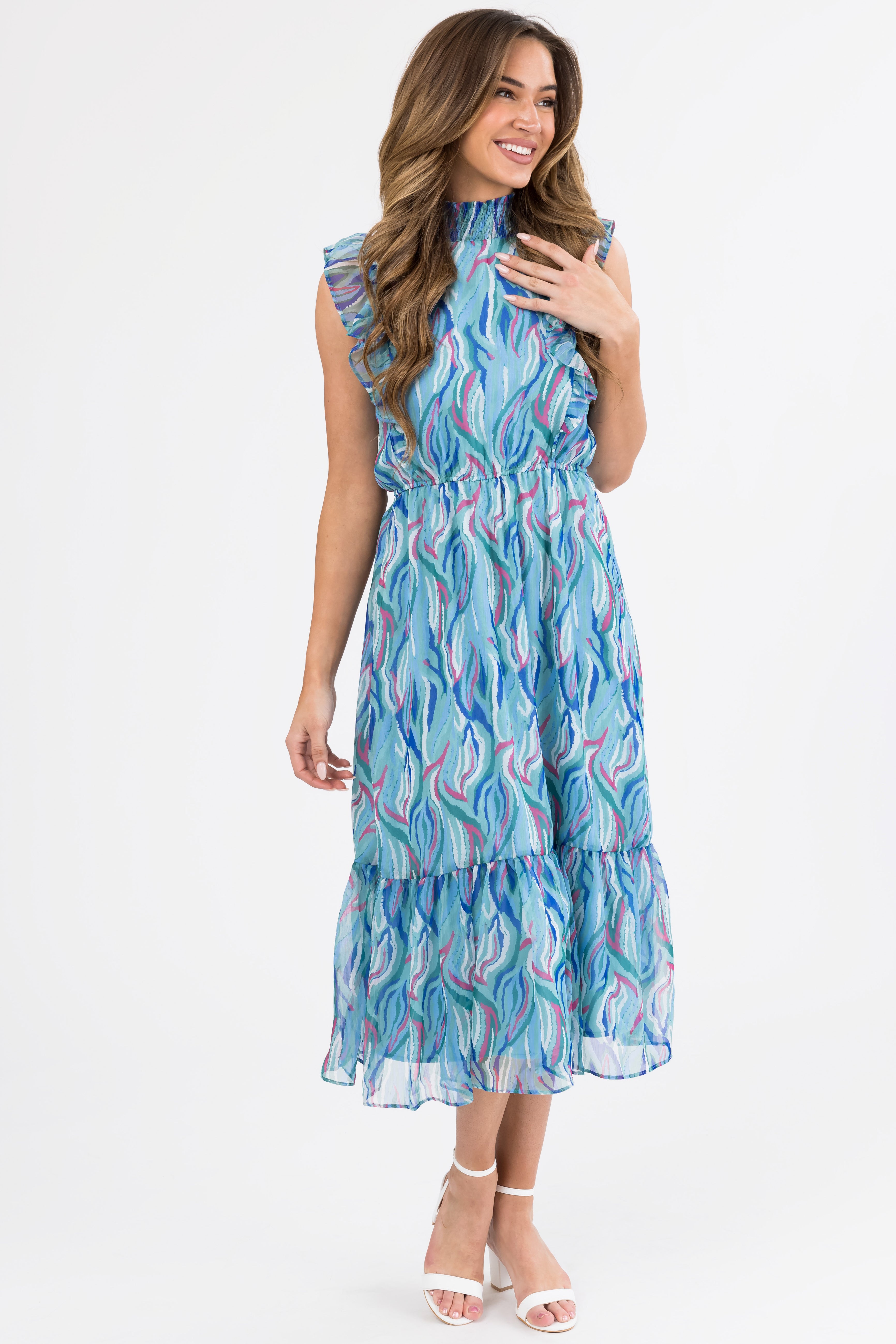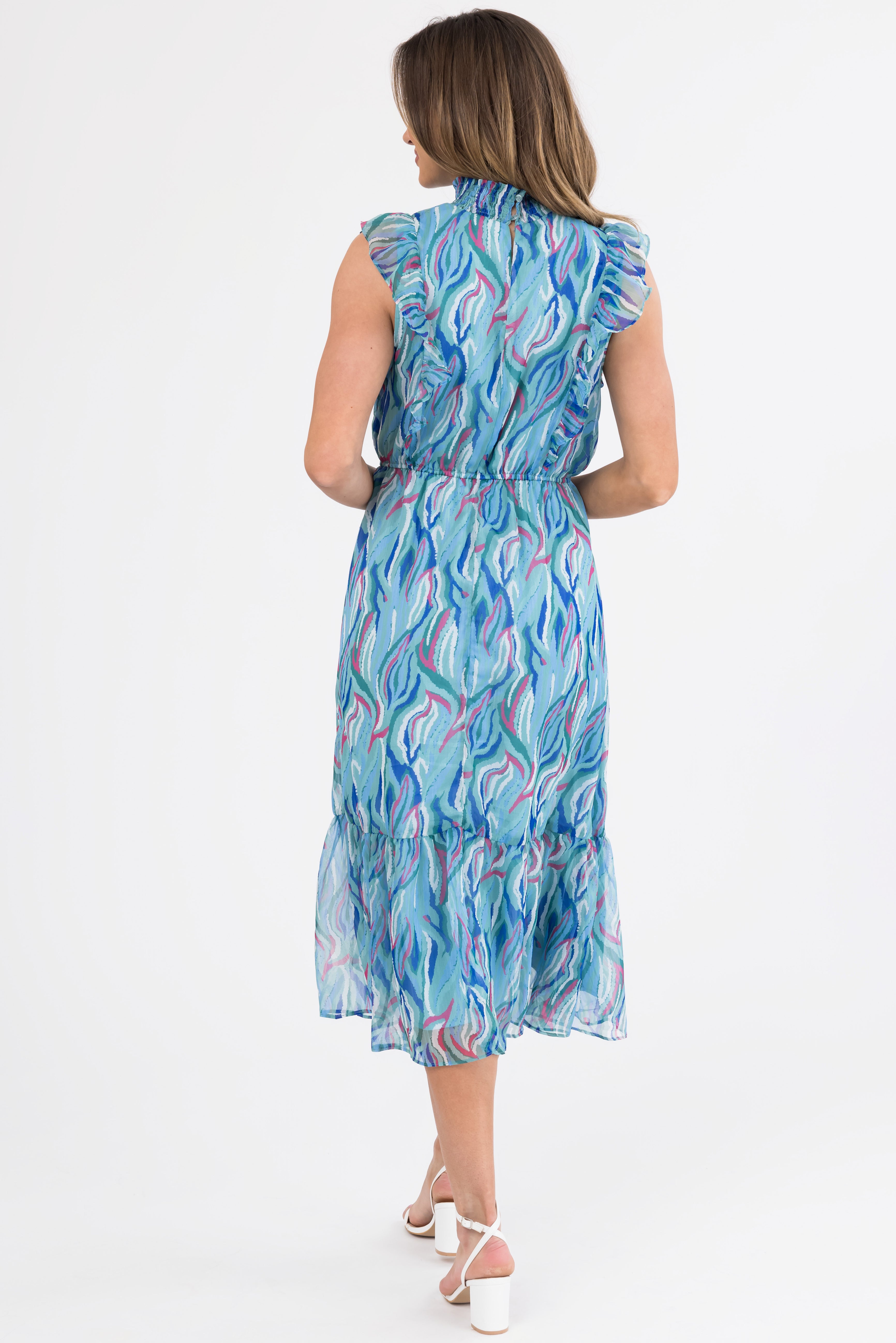 - Abstract print in shades of Seafoam. Powder Blue. Cobalt. Pine. Coconut. and Berry