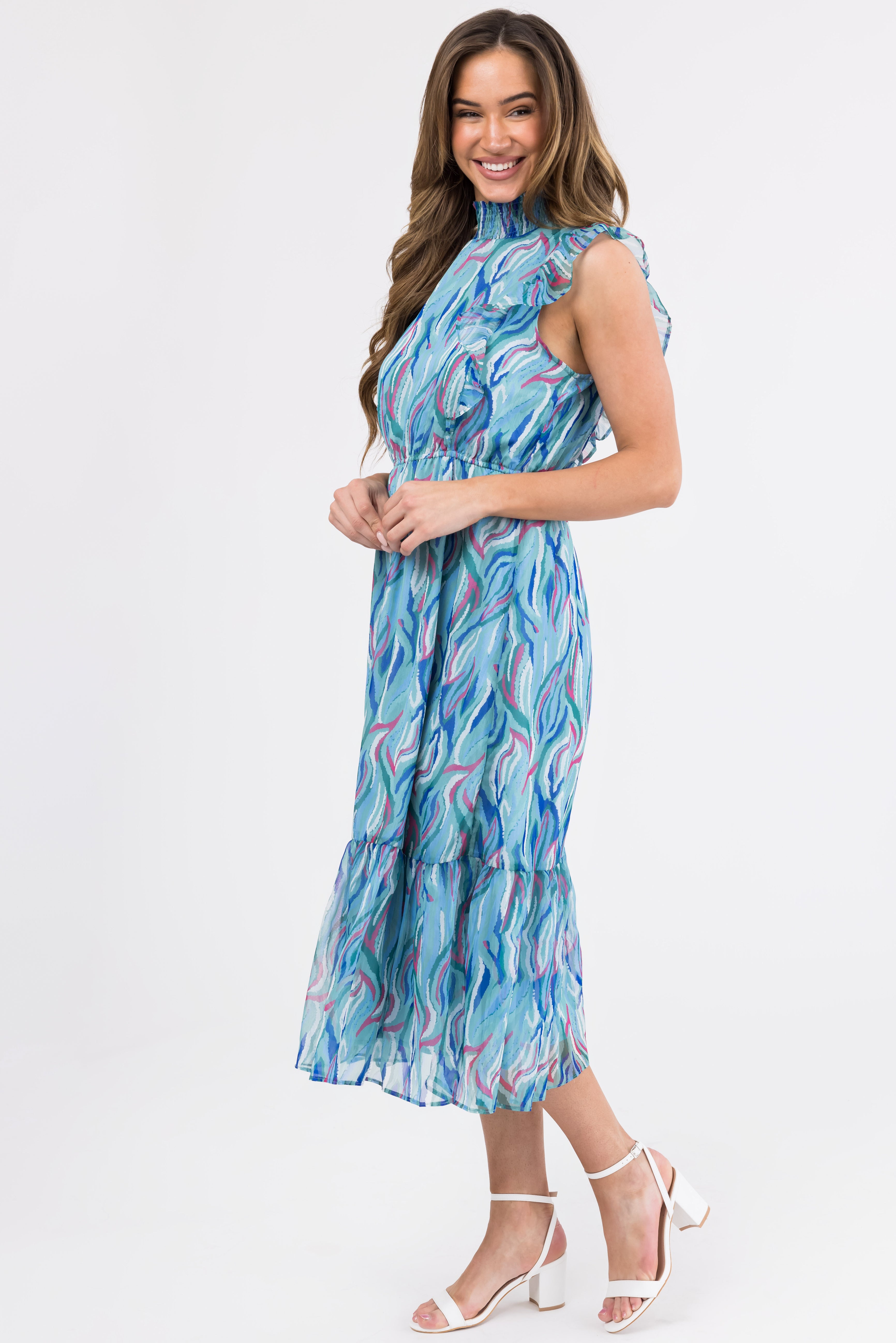 - Smocked mock neckline