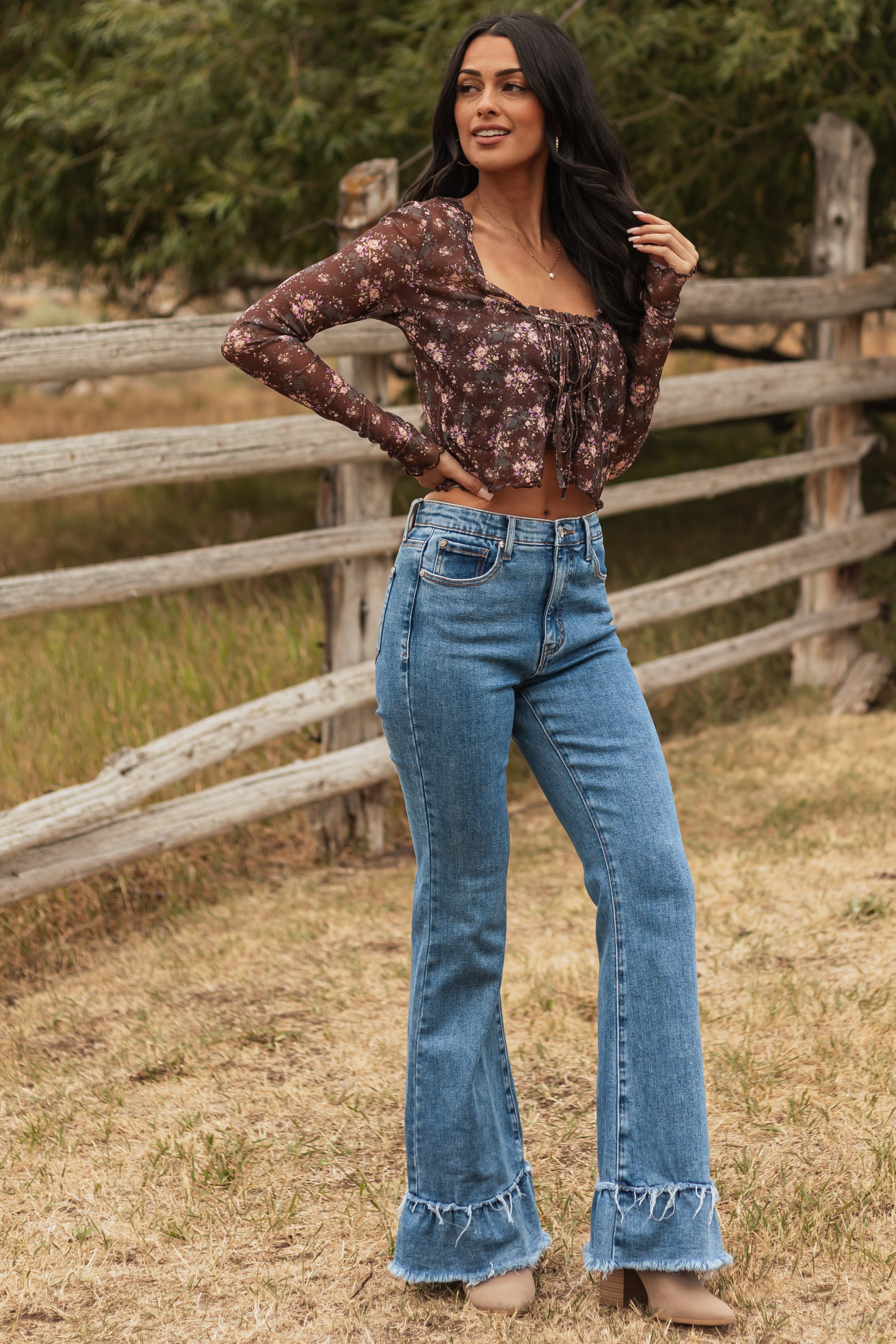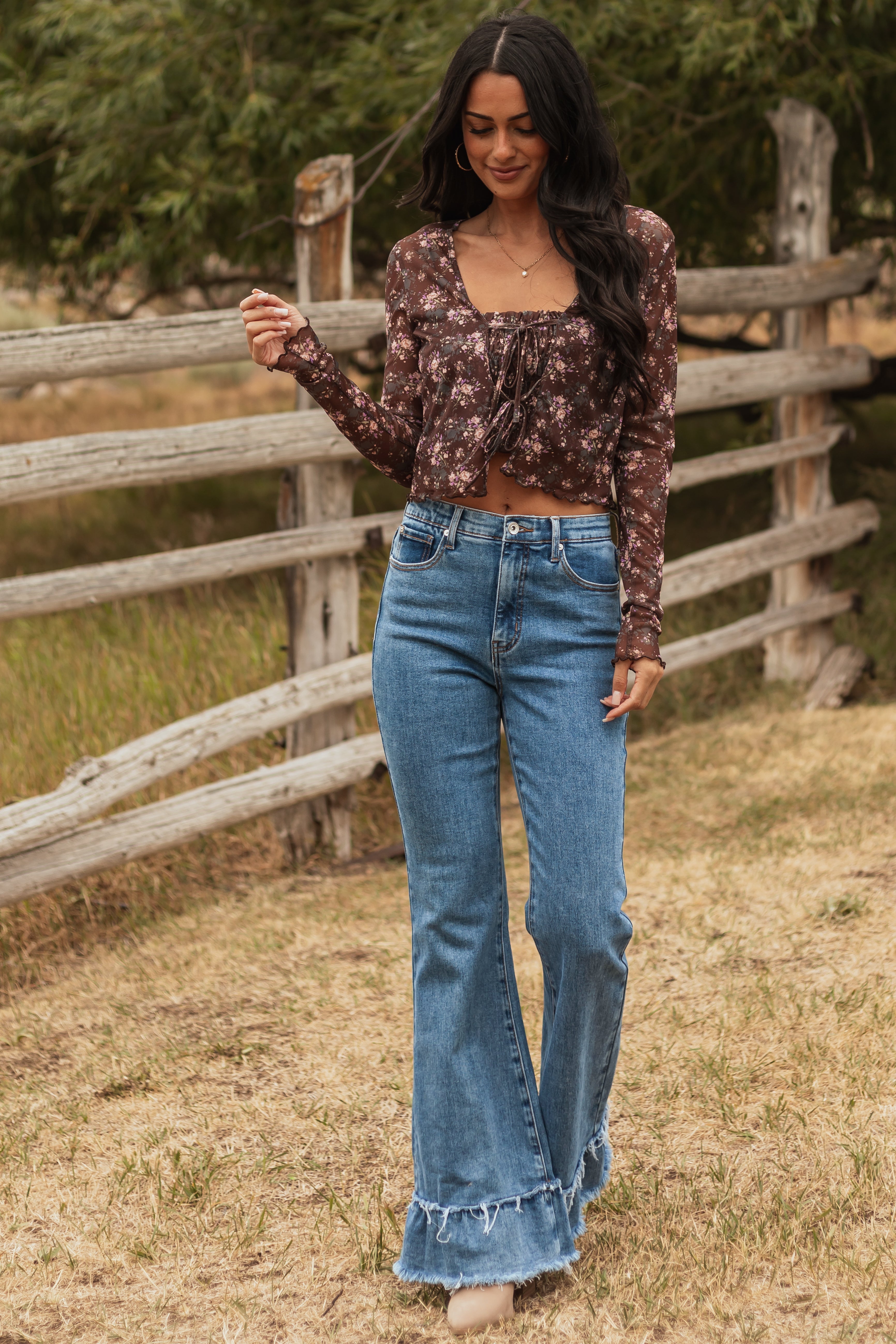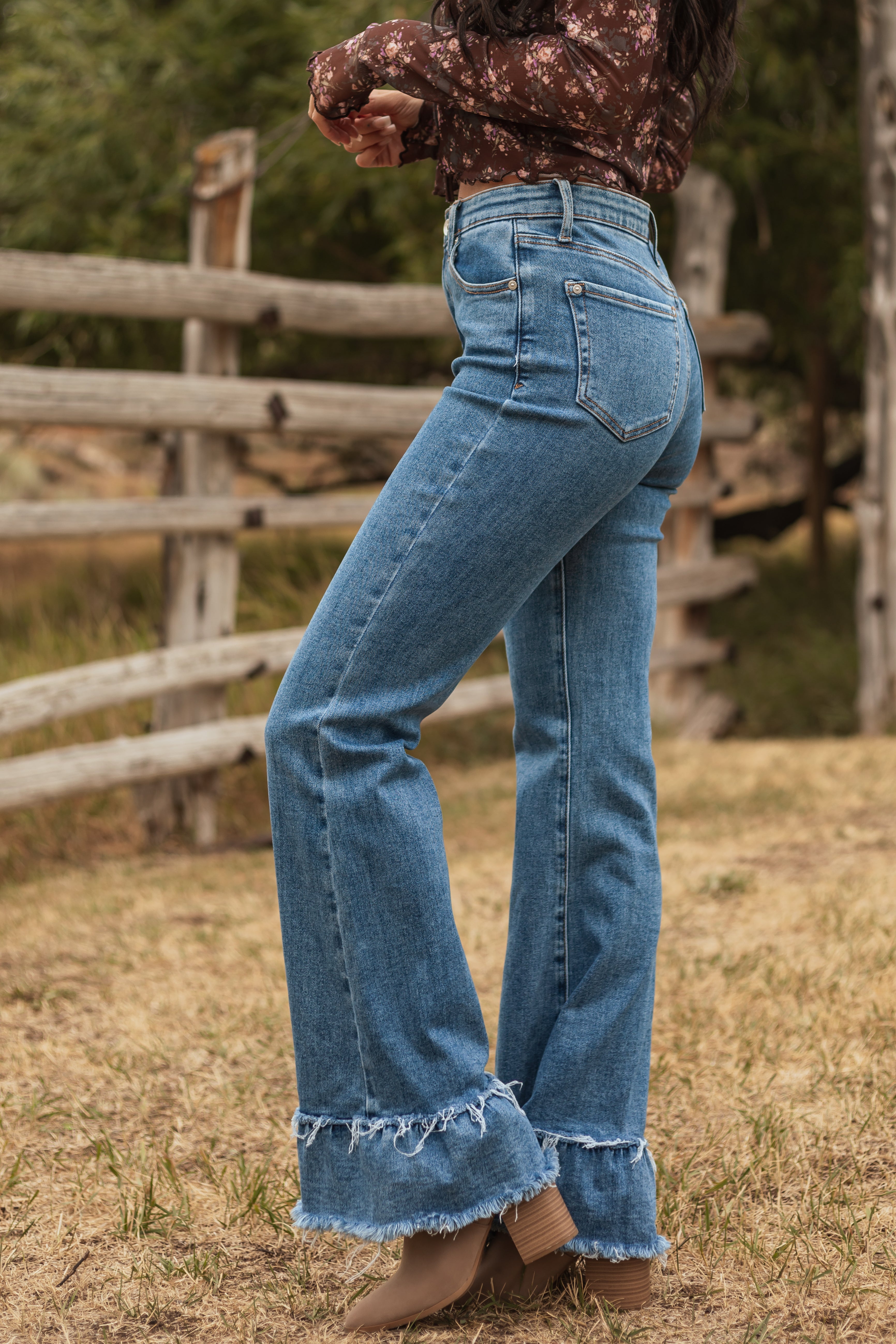 - These stretchy jeans feature built-in tummy control and a playful ruffle flare hem for a flattering. fashion-forward fit