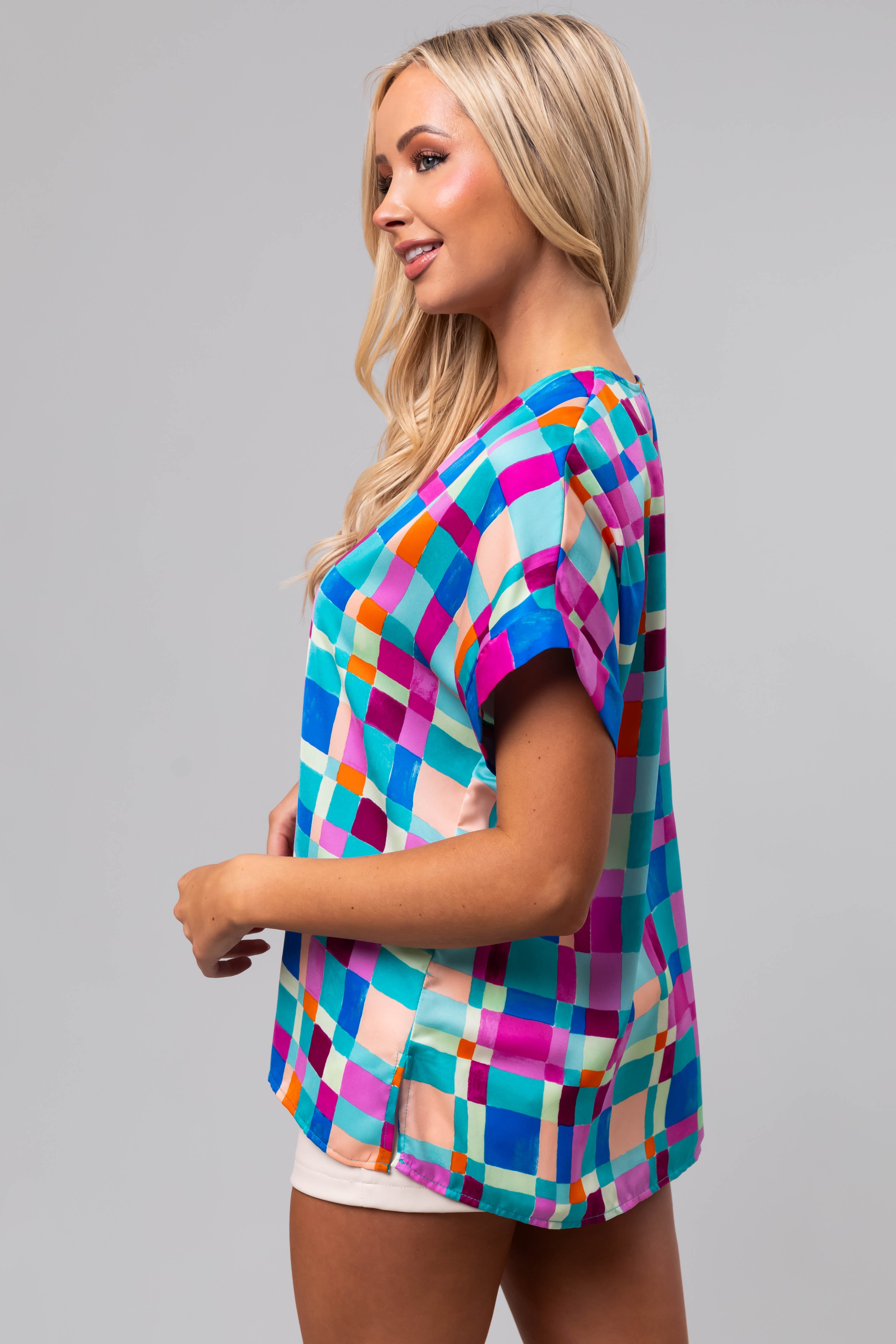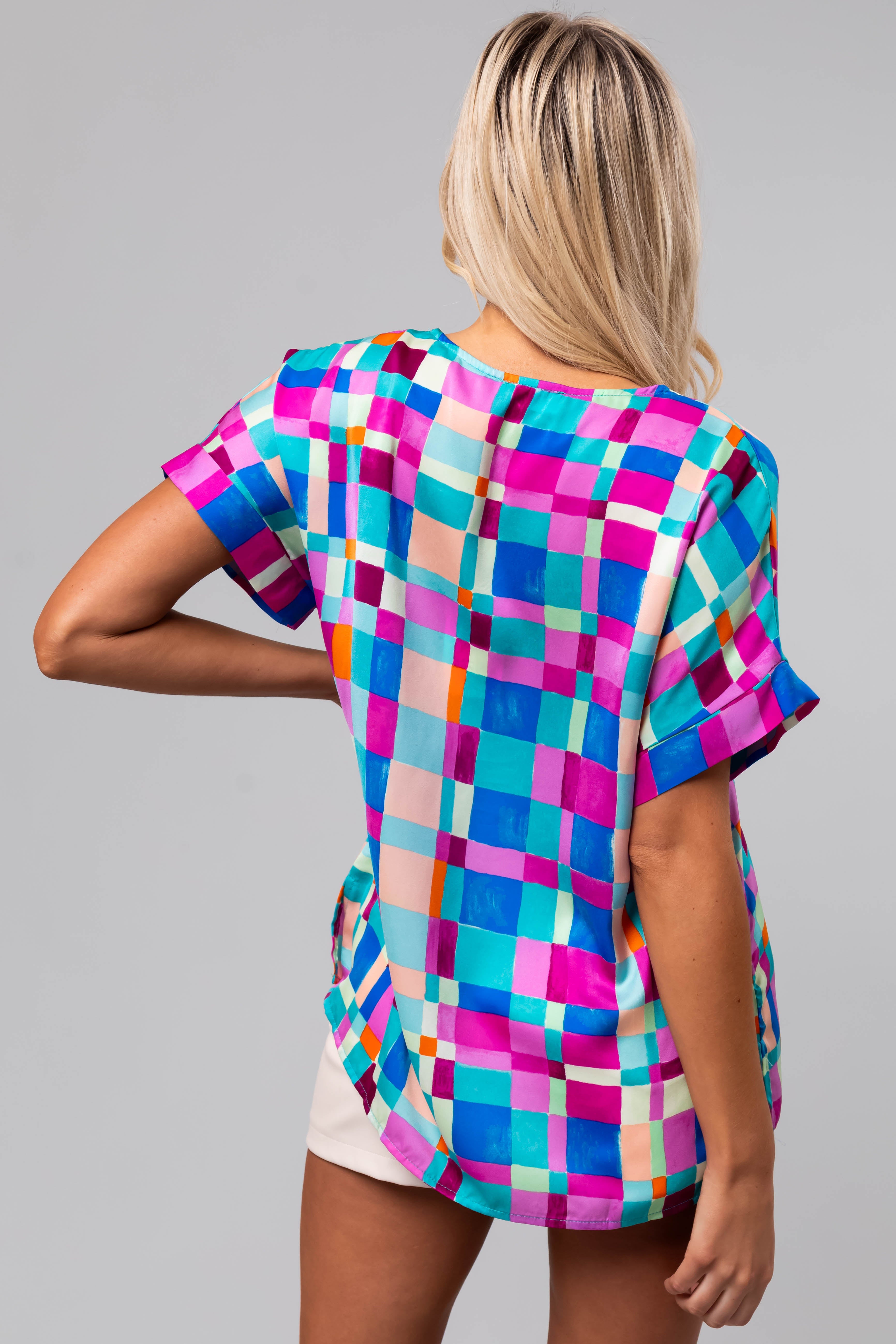- Geo print in the shades of Turquoise. Mint. Royal Blue. Peach. Sunset and Orchid